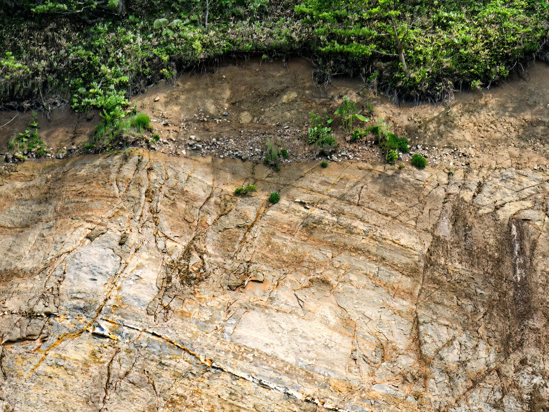 露頭中央の最上部には,傾斜した黒松内層の上に斜交不整合で載る水平な礫層が認められる(上写真3枚目).段丘礫層あるいは瀬棚相当層の可能性があるが,その詳細は明らかではない.