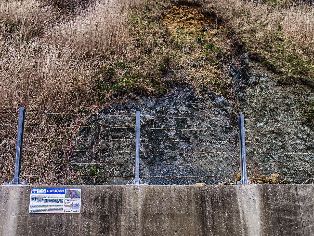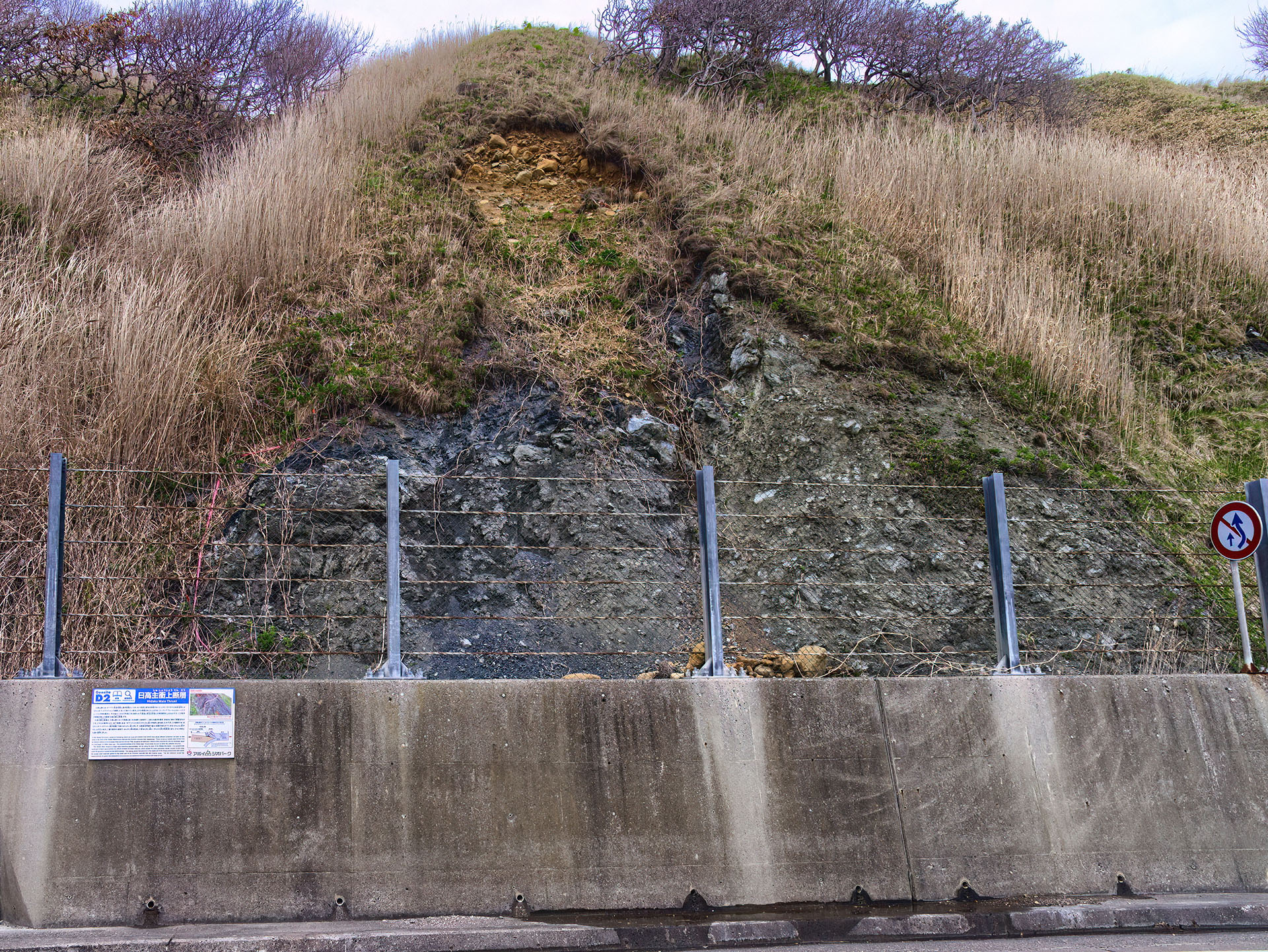 左写真は,様似町コトニ南方,いわゆる『日高耶馬渓』と呼ばれている海岸を走る国道 336号線沿い,東冬島トンネルのえりも町側抗口のそばにある “日高主衝上断層” の露頭である.道路の上方は平坦な段丘面になっている.露頭自体はクリーンであるが,露頭の前にコンクリート擁壁とネット・ワイヤーを張った防護柵が設置されており,擁壁裏のスペースがほとんど無いので,露頭の近接観察は非常に難しい.また交通量のある国道脇で駐車スペースなどがほとんど無いので,十分な注意が必要である.