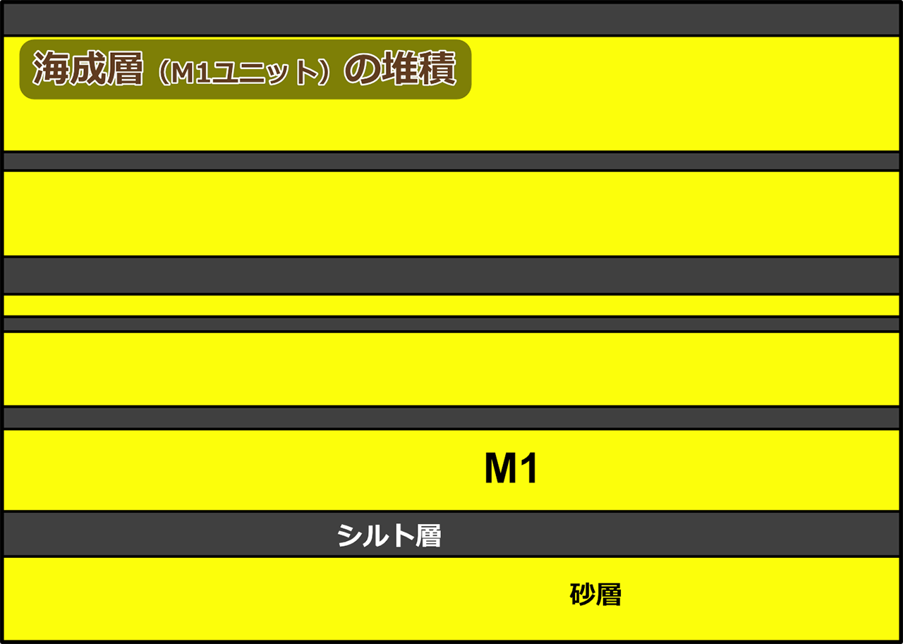 まず,M1 ユニットの砂層/シルト層互層が堆積します(右図1枚目).これは海成層なので上方に海底面があるはずです.堆積深度は 10 m オーダーのものと思われますが正確には分かりません.いずれにせよ,これらの堆積層がある程度圧密する程度のものです.