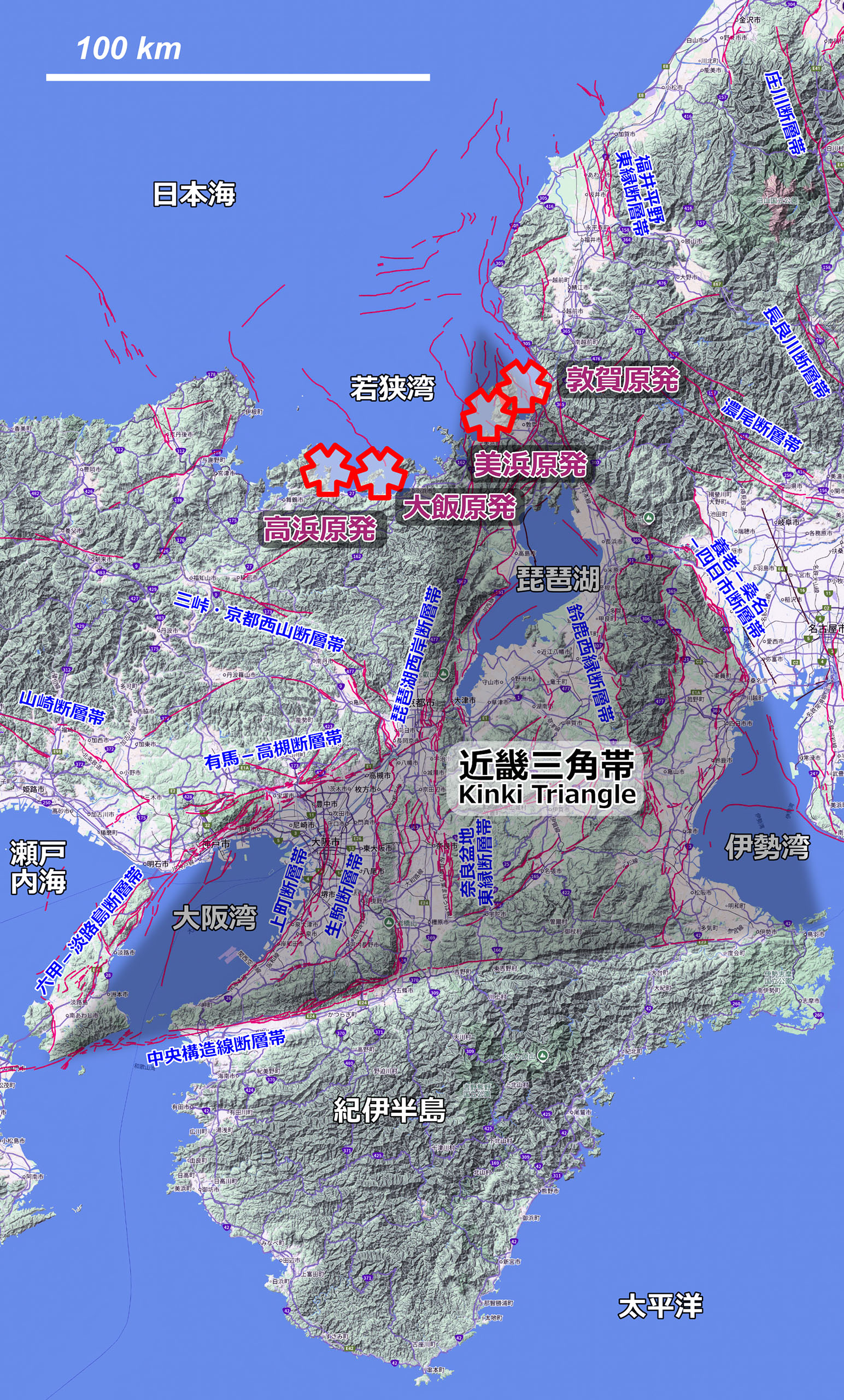 “近畿三角帯 Kinki Triangle” は,近畿地方の活断層集中域で境された大構造地形域を指します.その三辺は,おもに山地前面となっており,三角帯はそれに囲まれた低地領域です.敦賀半島はその頂点に位置しています.左辺の南部は阪神淡路大震災を引き起こした六甲-淡路島断層帯で北部は琵琶湖西縁断層帯,右辺は養老-桑名-四日市断層帯とその北方に続く柳ヶ瀬-関ヶ原断層帯(既出),底辺は日本列島最大の活断層である中央構造線断層帯からなっています.
