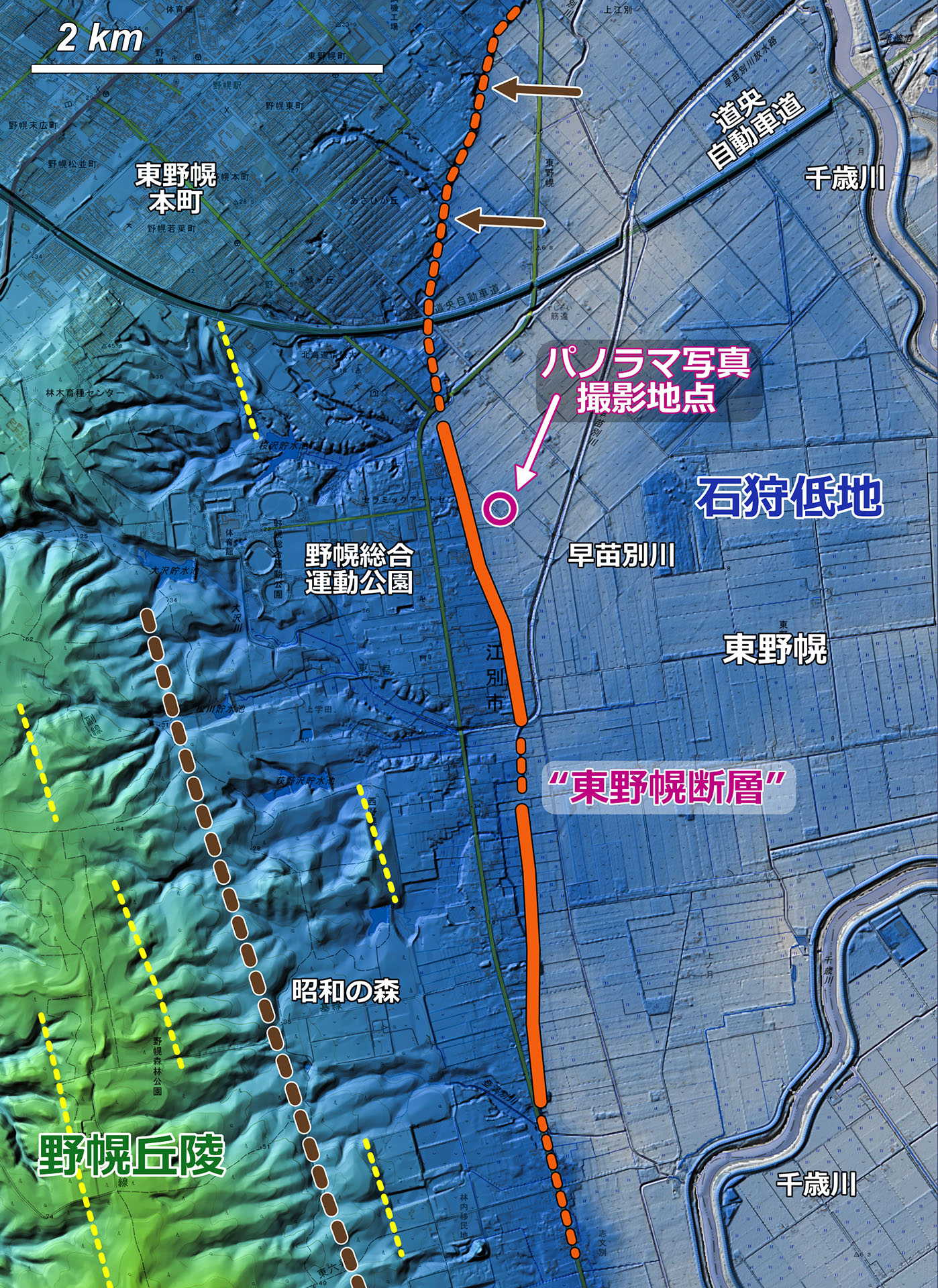 この走向は,石狩低地東縁断層帯の走向や,この地域の卓越リニアメントの方向とは 30° 程度斜交しており,傾斜の違いを含めて両者が異なった “系” に属していることを示しています.