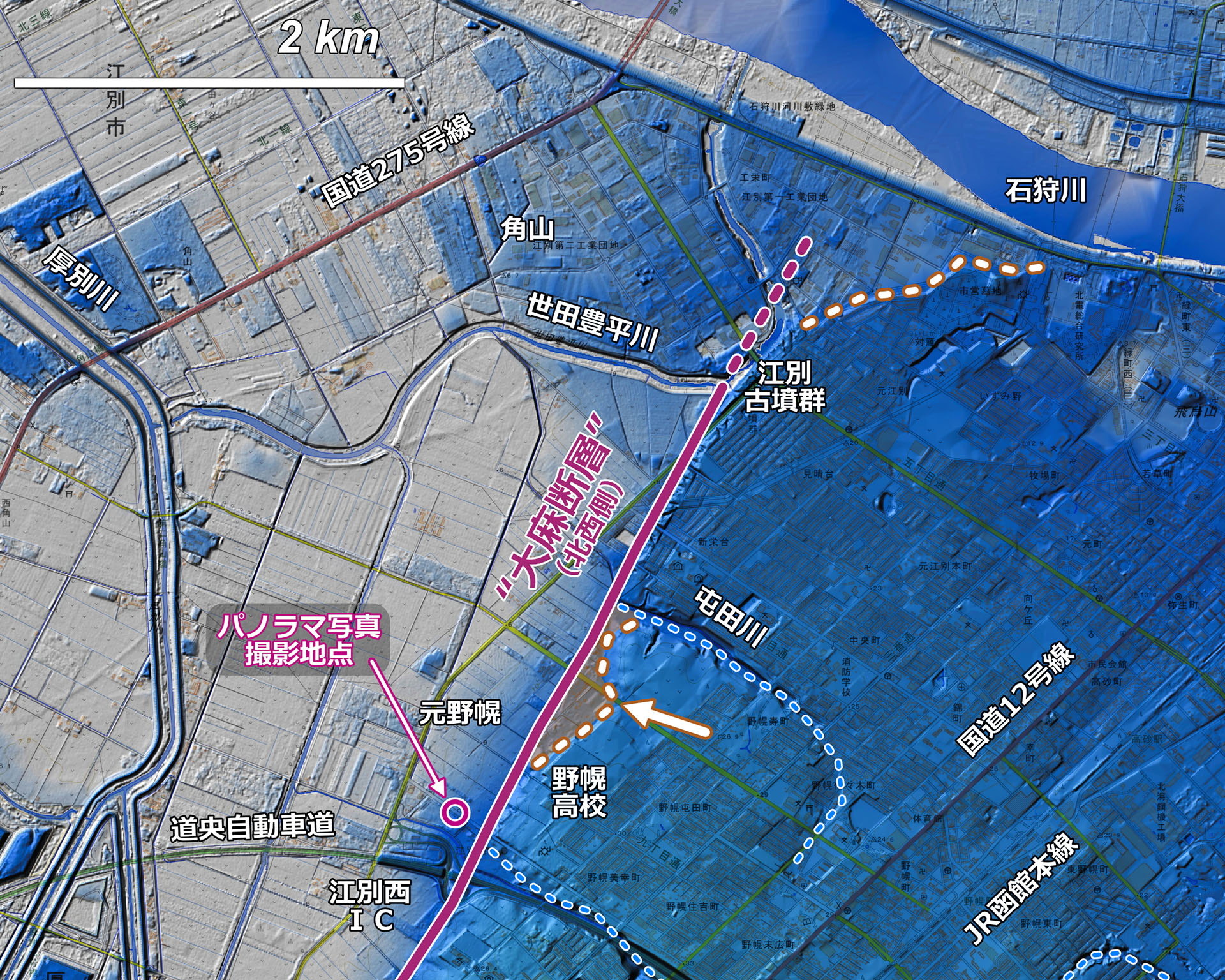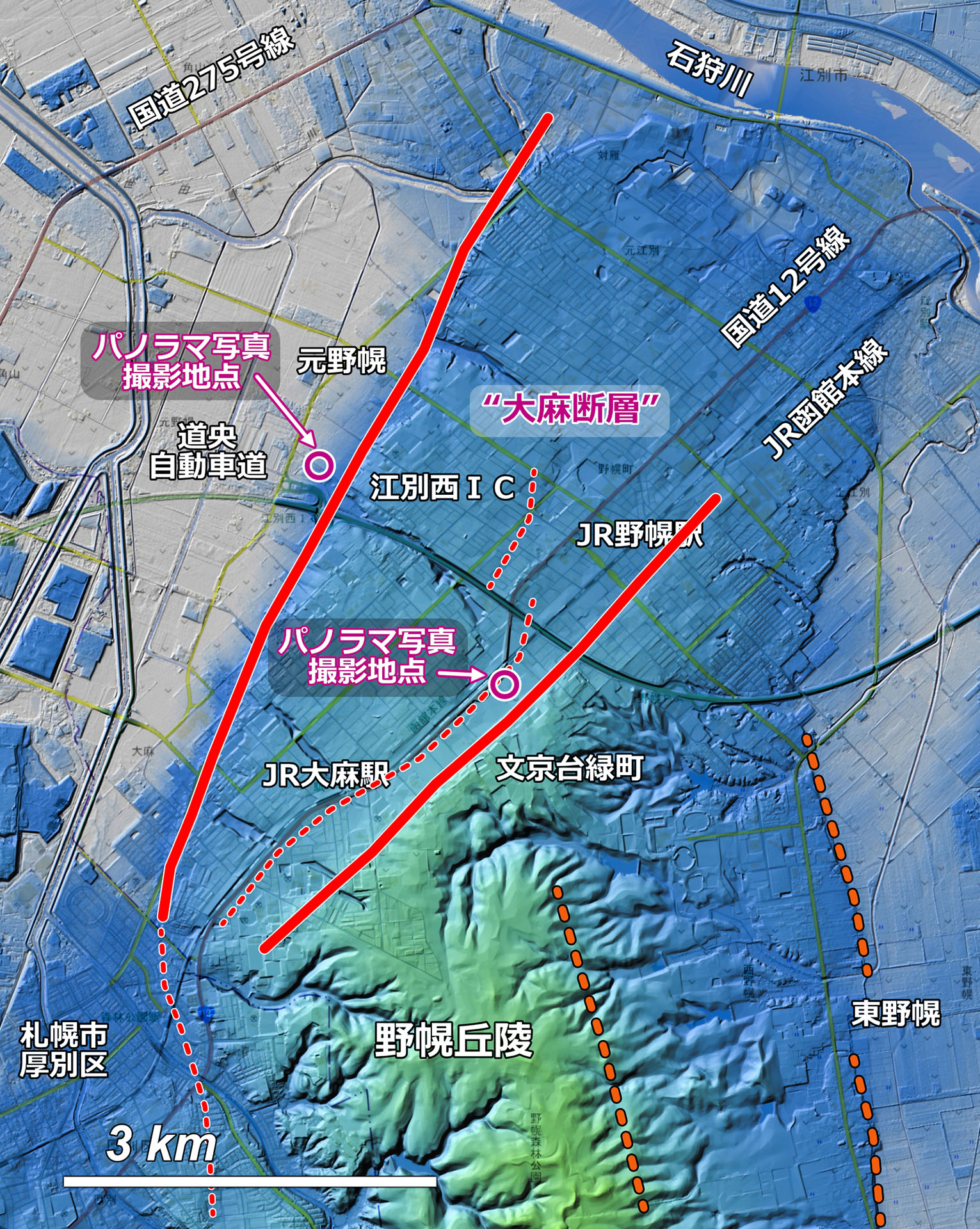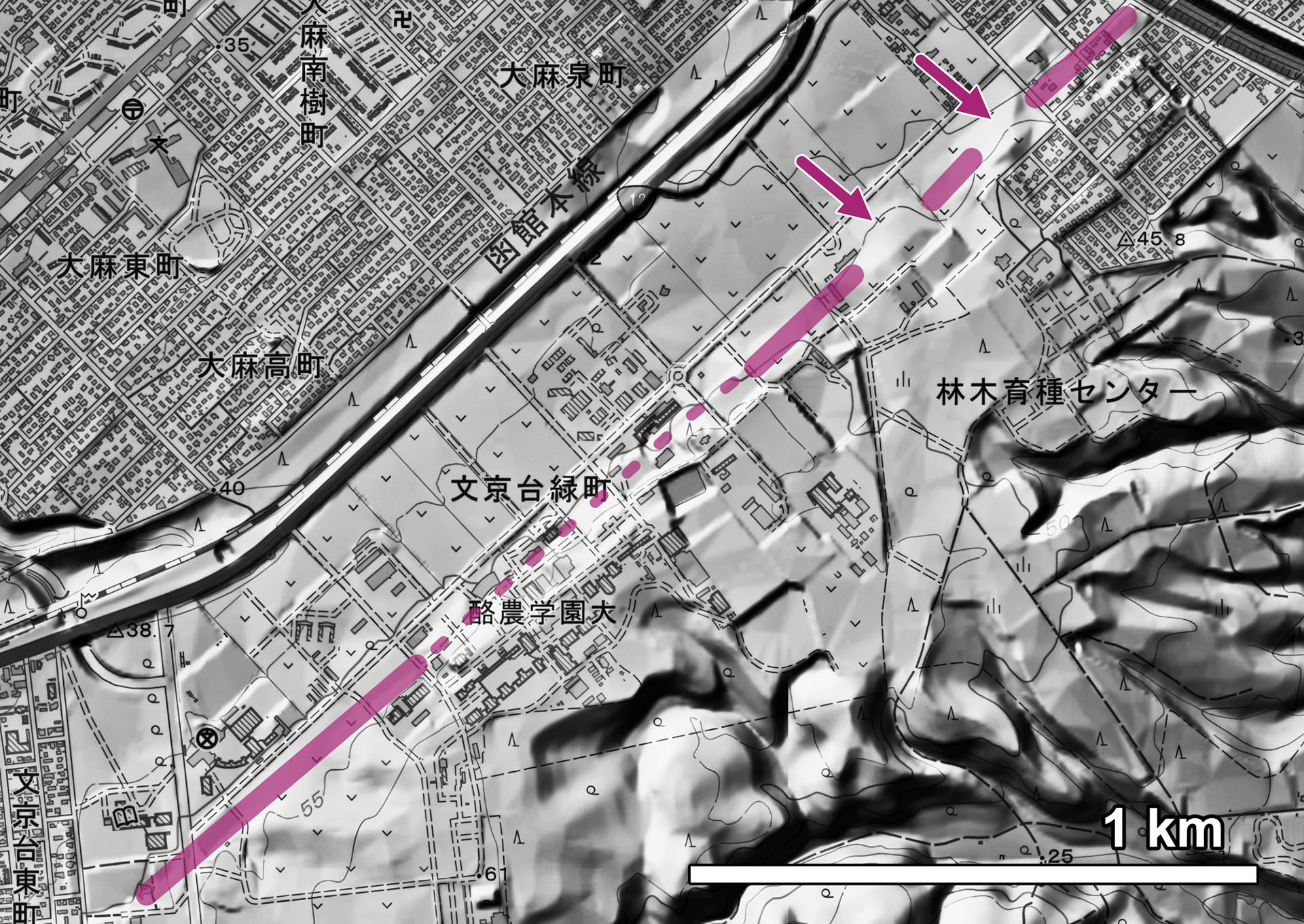 馬追丘陵西縁部には,約 30° 東傾斜の低角逆断層である馬追断層があります.馬追断層と胆振東部地震の震源断層は姿勢(=走向傾斜)が異なっており,両者の接合・会合関係はあまりよく分かっていませんが,上述したように異なる “断層系” に属するものと思われます.