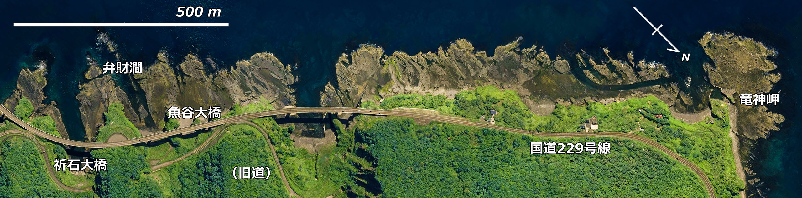 これらが離水ベンチであるとして,その成因として『地震の際の地盤変動(隆起)』(渡辺ほか,2013 など)の他に,素人考えですがその高さから言って『縄文海進の際に形成された波食ベンチが海退で離水したもの』という可能性も排除することはできないような気もします.しかし,上に書いたように半島東岸部にはこのようなものはほとんど見当たらず,渡辺ほか(2013)が指摘したように半島北西部で離水ベンチの高さが大きくなることから,地盤隆起による可能性が高いと思われます.