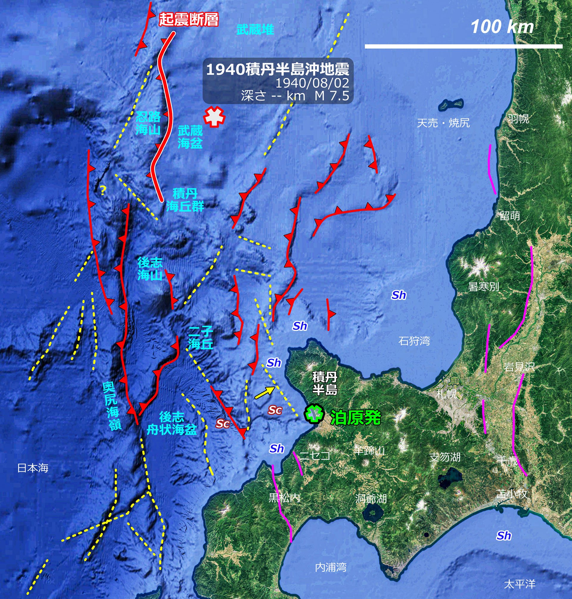 積丹半島沖の海底地形(Google Earth)と1940積丹半島沖地震起震活断層.海底活断層(赤線)は,北海道大学理学研究科附属地震火山研究観測センターによる 北海道北部沖の海底地下構造探査および自然地震活動調査 等を参考に作成.陸上活断層(マゼンタ線)は産総研活断層データベースによる.断層線に付されている三角マークは,おそらく断層面傾斜.黄色点線は独自に読み取った海底リニアメント.Sh:陸棚,Sc:海底谷.マウスオーバーで海底活断層・リニアメントを非表示にする.