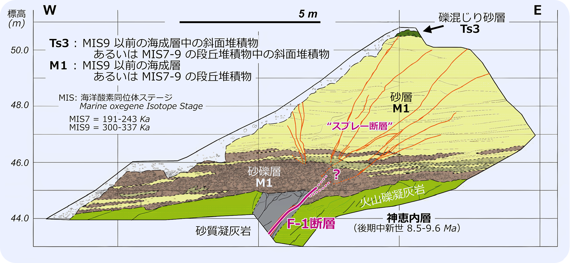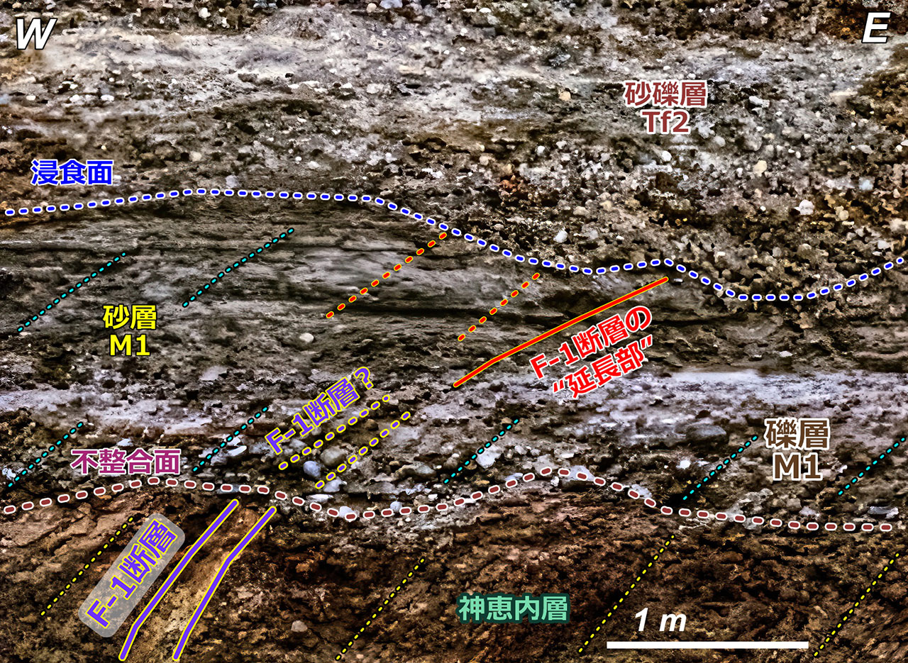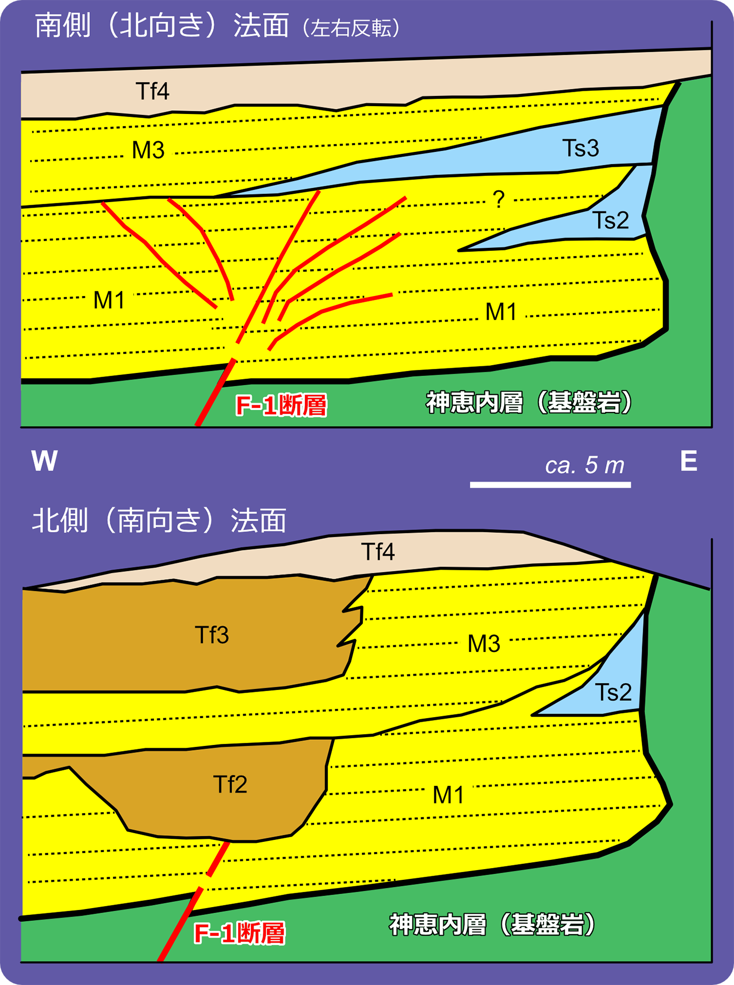 ③ M1 ユニットを切る F-1 断層の延長部は変位量が非常に小さく,破砕面も伴わず一部は面なし断層.それらが F-1 断層を形成した構造運動によって形成されたかどうかは微妙な点がある.また,堆積時の地表面(海底面)まで達していなかった可能性もある.