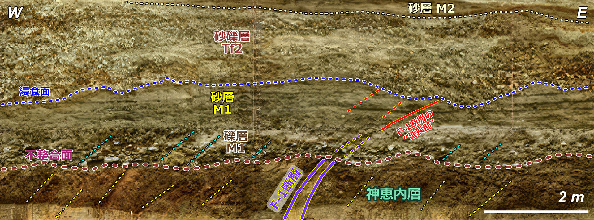 F-1 断層と Tf2 礫層との関係で “不可思議” なものは,上の左写真で青色半透明シェードで示した M1 ユニット砂層の『三角形状突出部』です.この形状は,Tf2 礫層下底の浸食面とは大きく異なっています.その左側の辺は F-1 断層の延長部と一致しており,一見 Tf2 礫層を断層が切断しているようにも見えてしまいます.しかし仮に断層面と仮定した場合,その上盤に相当する M1 ユニットの変位部分が存在しないため,Tf2 礫層と M1 砂層が断層関係にあるとすると変位量がまったく合わないという大きな矛盾が生じてしまいます.