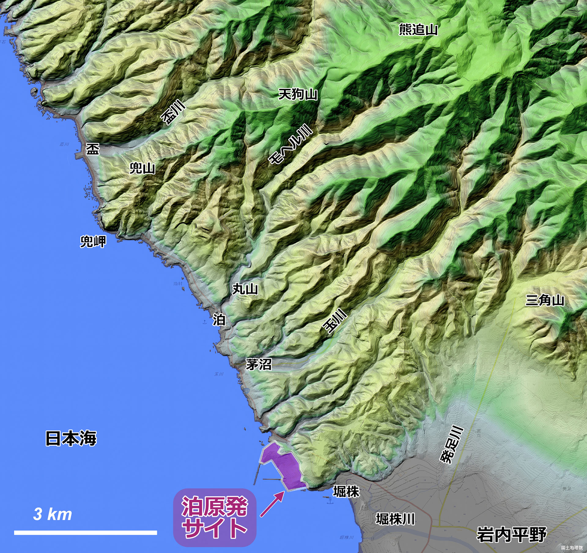 もしそうであれば,この離水ベンチは(能登半島のように)大きな地震の際の隆起イベントによって形成されたということになります.半島西岸側に多く見られる=隆起量が非対称・不均質ということの意味は不明ですが,震源が日本海側ということで制御されているのでしょうか? 言うまでもなく,そのイベントがいつ生じたのか・複数のイベントによる累積されたものなのか・どの起震断層によるものか...については考える手がかりはほとんどありません.