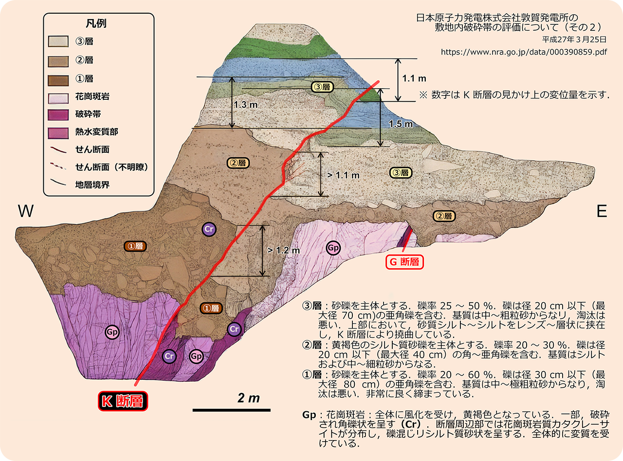 K 断層の露頭スケッチ.原子力規制委員会(2014)図9-2の左右を反転しキャプションの位置を付け替えたもの.