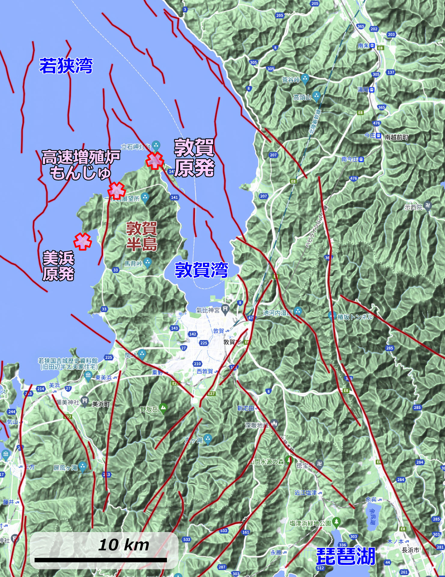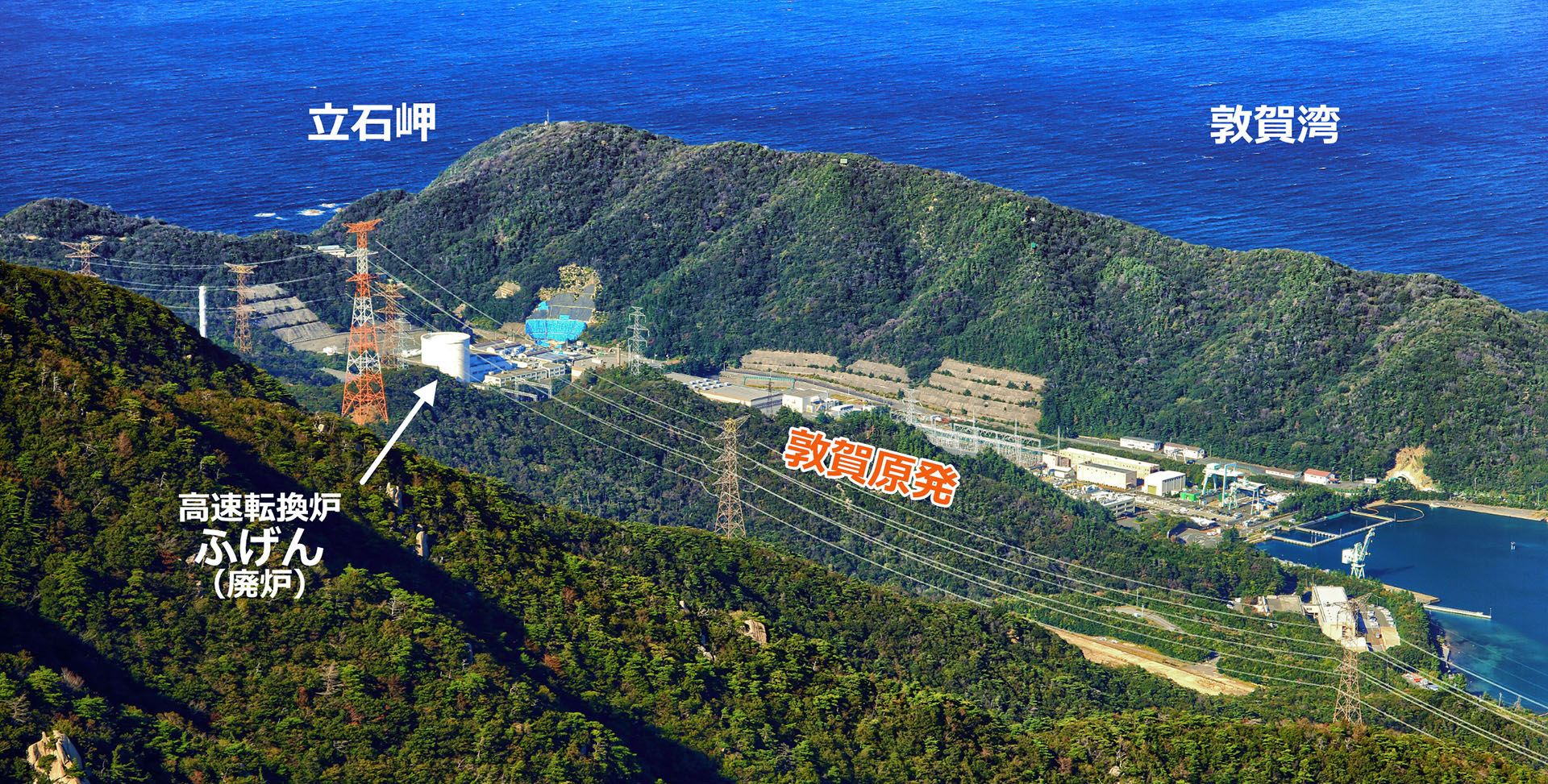 敦賀半島には東西両岸部に敦賀・美浜という二つの原発があり,その水平距離は 10 km もありません.敦賀原発の北側には『高速転換炉ふげん』(廃炉)が隣接しており,それに加えて例の『高速増殖炉もんじゅ』(廃炉)が敦賀・美浜原発の間にあります(左図).