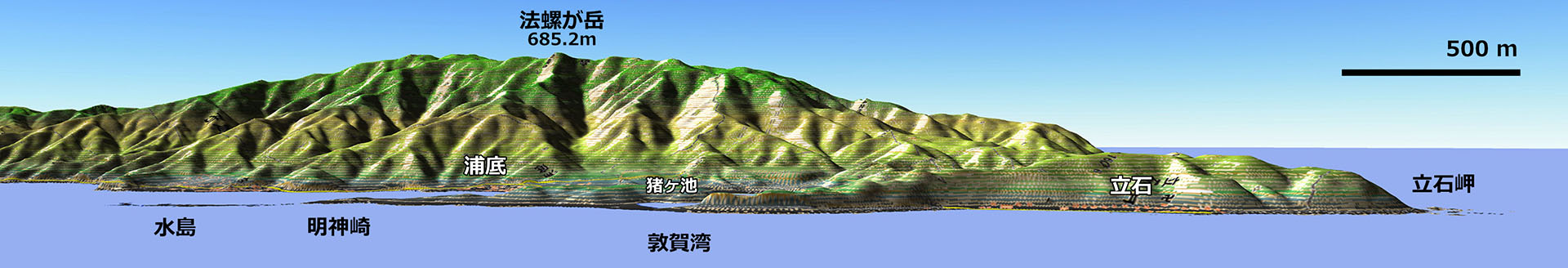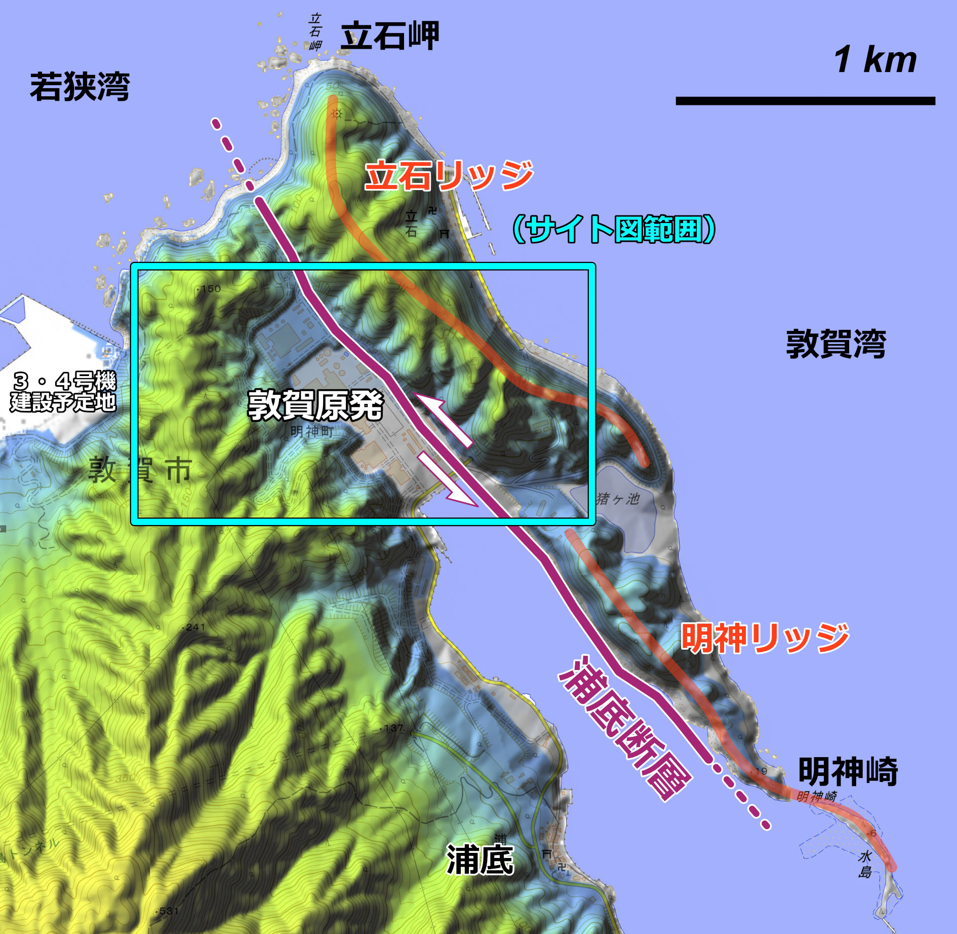 敦賀湾に面する部分に NNE-SSW 方向の立石岬~明神崎を結ぶ狭いリッジ地形があり,その裏側には細長い入り江があります.敦賀原発はその先端から続く低平坦地を開削して建設されています(右図).リッジ地形は単一・直線的というわけではなく,二本の雁行状リッジからなります.以下ではこれらを暫定的に “立石リッジ・明神リッジ” と呼びます.リッジは北北西側が高く,南南東へ次第に低くなり海面下に没しています.そのためこの部分を上から見ると細長いオタマジャクシ状(?)の特異な形状になっています.最高点は立石付近の 160.6 m です.