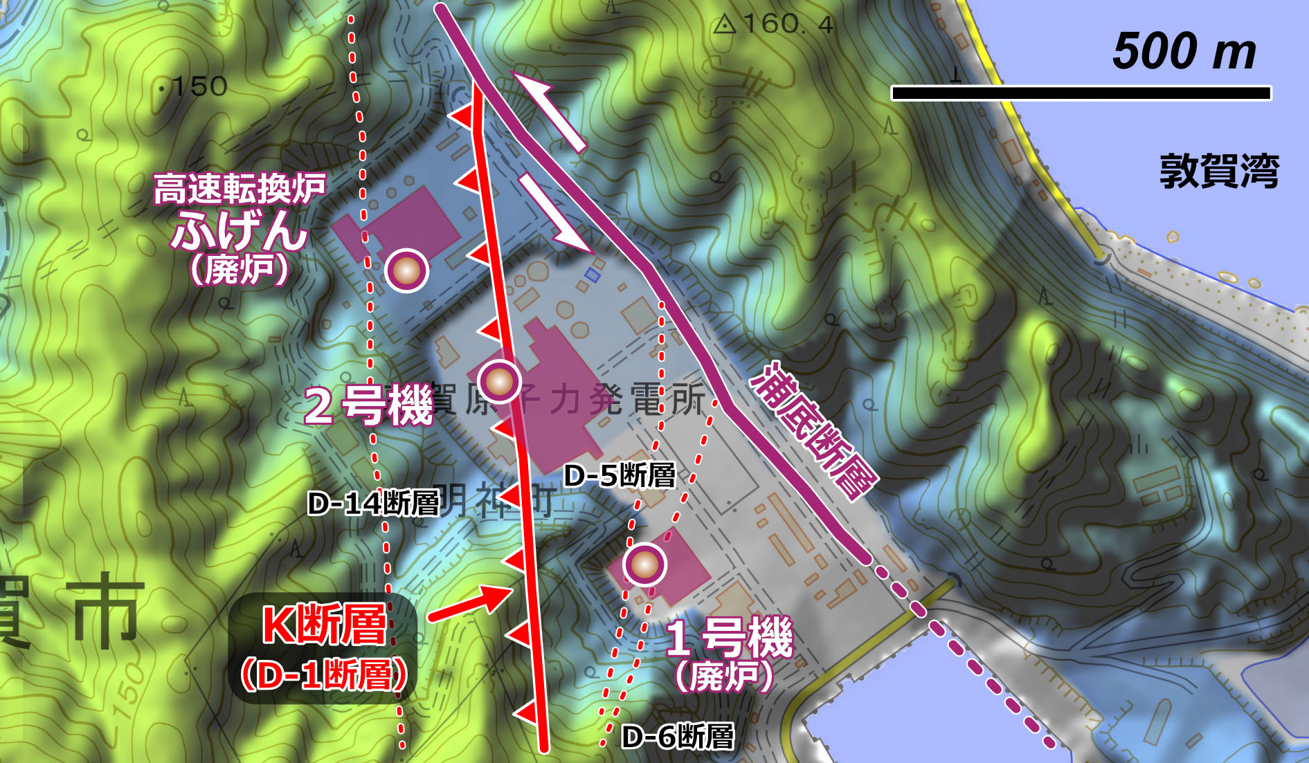 敦賀原発で問題となるのは,浦底断層に斜交するほぼ南北走向の小さな断層で,『K 断層』あるいは『D-1 断層』と呼ばれるものです.名称の違いは,検討したトレンチの不連続性から来るもののようですが,よく分かりません.ここでは『K 断層』と表記します.