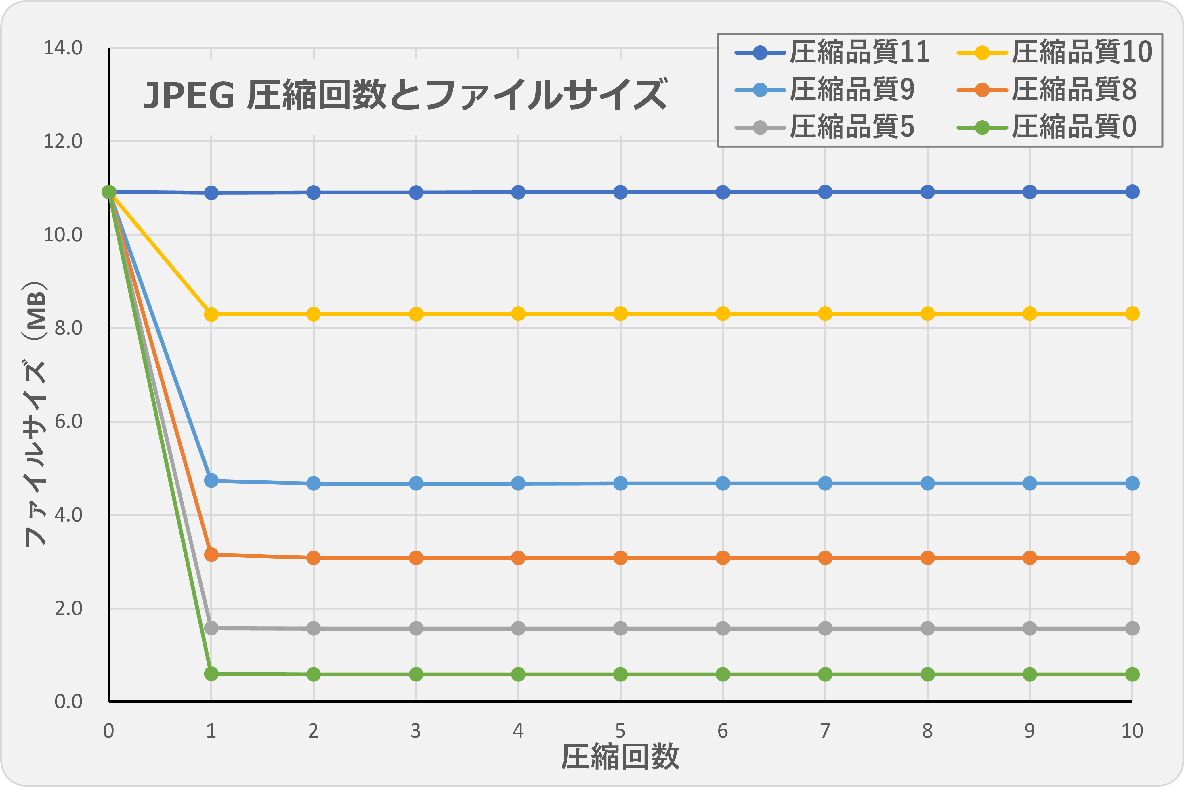 なお,圧縮品質 11 は Lightroom の画像品質 92 にほぼ相当すると考えられますので,1回目の圧縮は同じ品質での再圧縮となり,ファイルサイズは変化していません.