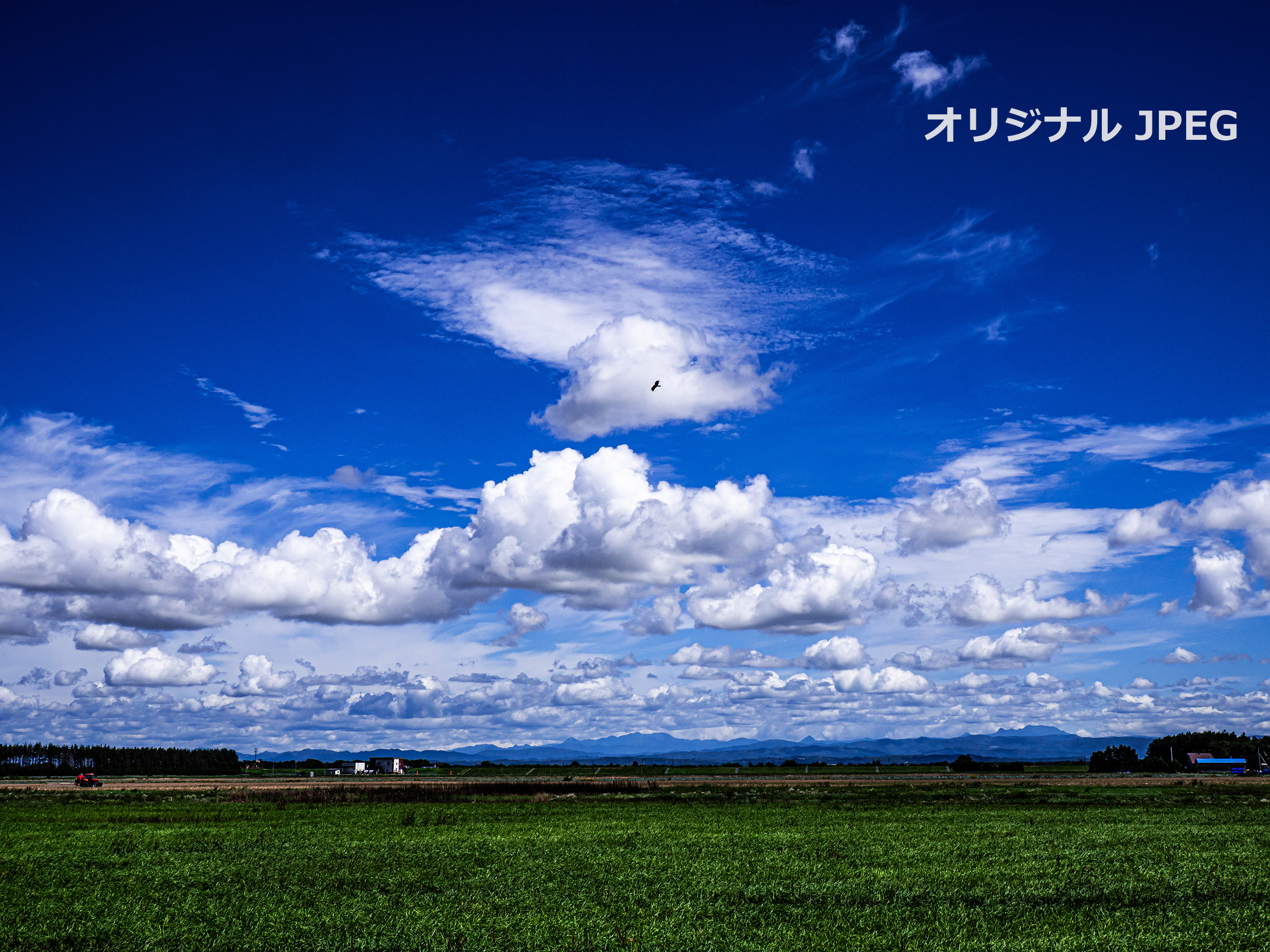 ピクセル等倍表示などであれこれ確認してみると...① 中央上を飛んでいる鳥の周囲や下部の山の稜線などにモスキート・ノイズが発生している,② 空の部分などに浮いているノイズにパターン化が見られる,③ 下部の畑など細かいパターンにぼかしがかかったようになっている,といったところが主な変化です.