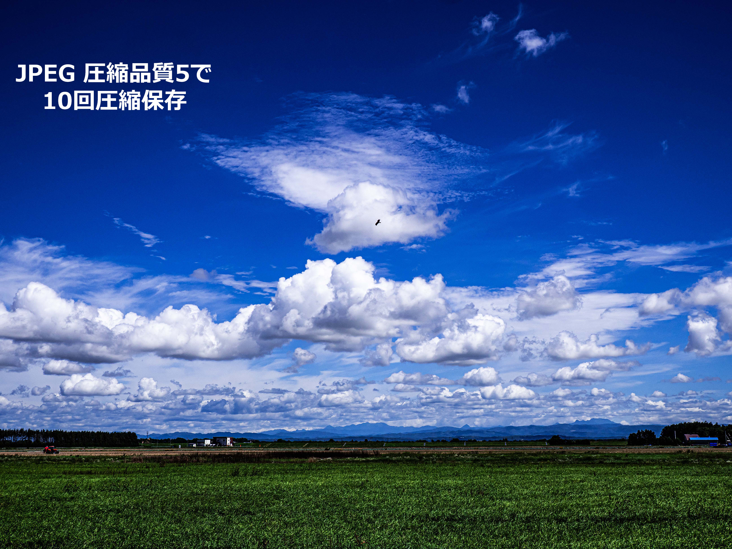 例えば,圧縮品質5で一度圧縮を行うと,上に書いたようにモスキートノイズや画像のパターン化などの圧縮 artefact が当然生じます.しかしそれらは,圧縮を繰り返しても著しい増加が見られるわけではありません.これは圧縮品質 11 での繰り返し圧縮も同じで,画質に変化はほとんど認められません.ただし,さすがに 10 回の繰り返し保存では,雲の部分など階調が滑らかなところにわずかなブロック・パターン化が認められるようになります.