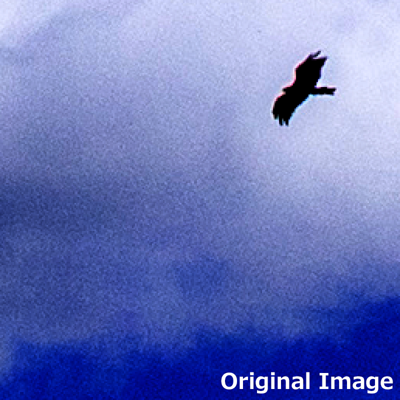 まずテスト画像ですが,下の項で使用した風景写真の一部です.Original Image は RAW から書き出した最高画質の JPEG ですが,レタッチの際にトーンを拡張しているので,細かな輝度ノイズが目立っています.鳥の周りには弱い色フリンジも見えます.
