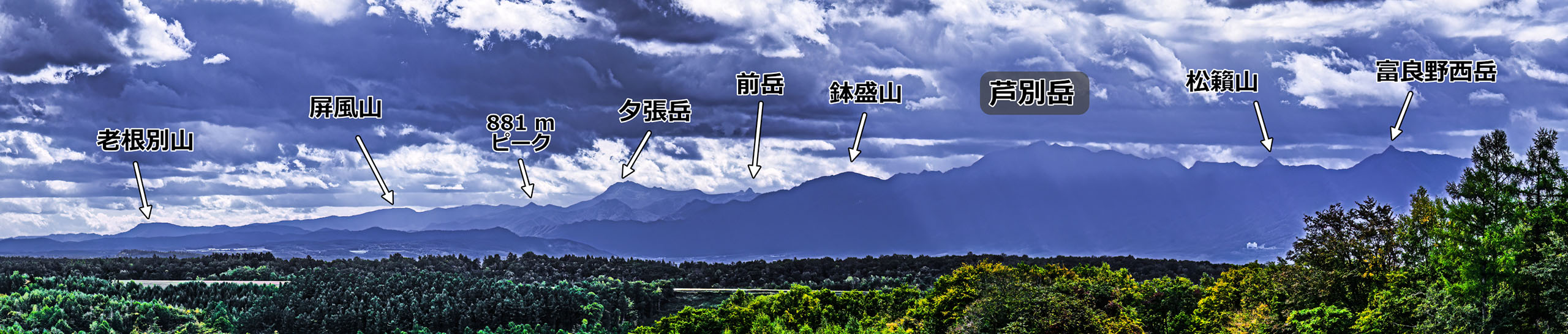 富良野盆地のど真ん中から芦別岳方面を撮影したのが上の写真です.芦別岳山稜はかなり斜めから見たビューとなっていますが,芦別岳はなぜか対称な良い形に見えます.おそらく芦別岳主山稜から東(富良野盆地)側に降りていくリッジによるものでしょう.鉢盛山の向こうには夕張岳が見えています.