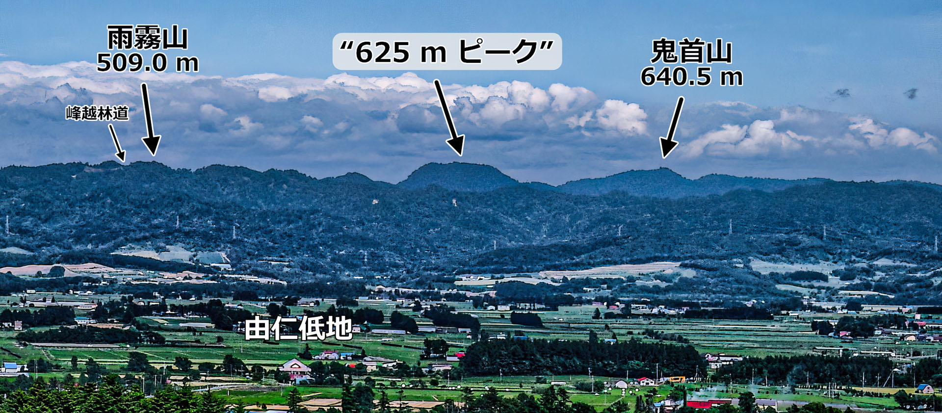 ※ このアーティクルで紹介する山々の名前の同定は,その大部分はカシミール3D(+カシバード)による景観シミュレーション中の山名表示機能によっています.しかし一部は,(山名があるにもかかわらずなぜか)山名が表示されないものがあります.また,写真中で明瞭なピークとして写っているのに,もともと山名が付されていないものもあります.このようなものについては,国土地理院地図上で見て推測したり,近接からの景観をシミュレートして見当をつけ,ピークの名前や標高を判断して描き入れています.しかし,その作業は非常に難しいというか曖昧なもので,結果が正しいか確認の持てないものあります.したがって,間違いを含む可能性もあることをあらかじめことわっておきます.