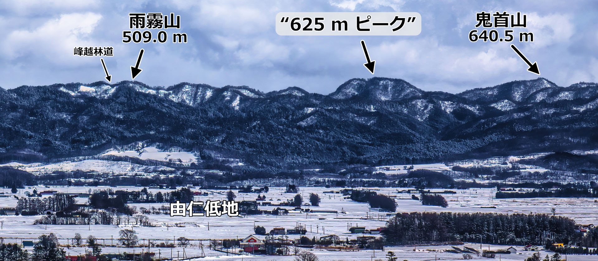 夕張山地のパノラマ写真の右側をよく見ると,規模は小さいのですが平頂な台地状地形がもう一つあります.右端の雨霧山と鬼首山の間に見える台形の稜線(“625 m ピーク”)です(右写真).このピークは今までなんとなく気づいてはいたのですが,それ以上追究していませんでした.右写真上ではよく分かりませんが,右写真下の冬の撮影では,625 m ピークが二つに小さく割れており,そこに沢型があることがよく見えます.