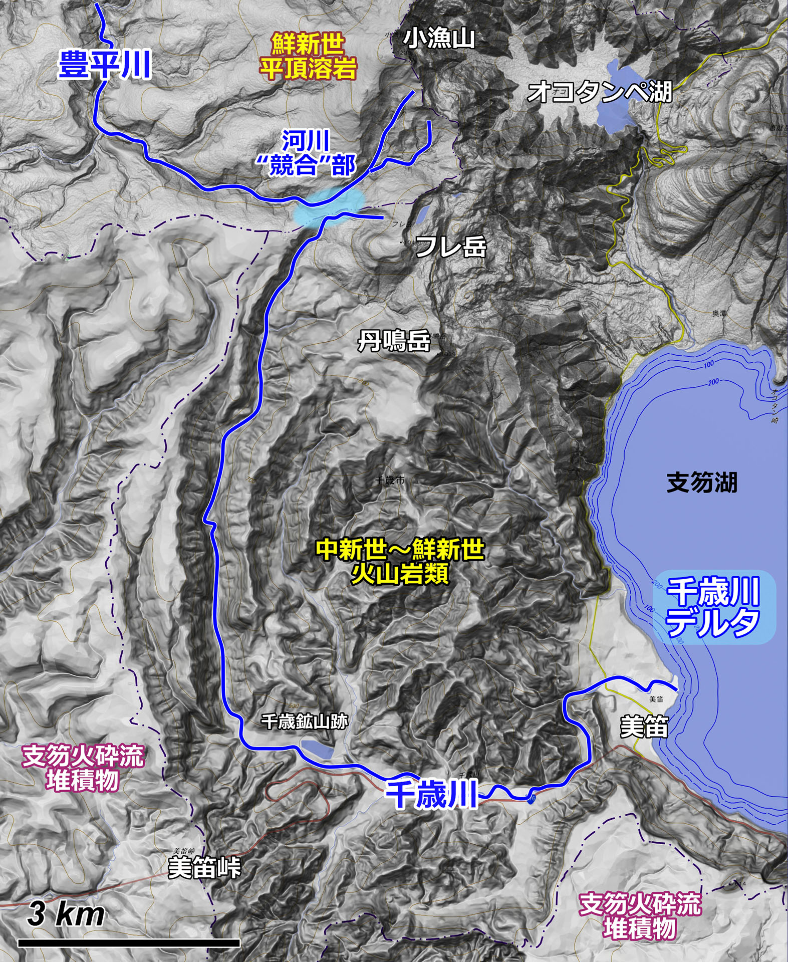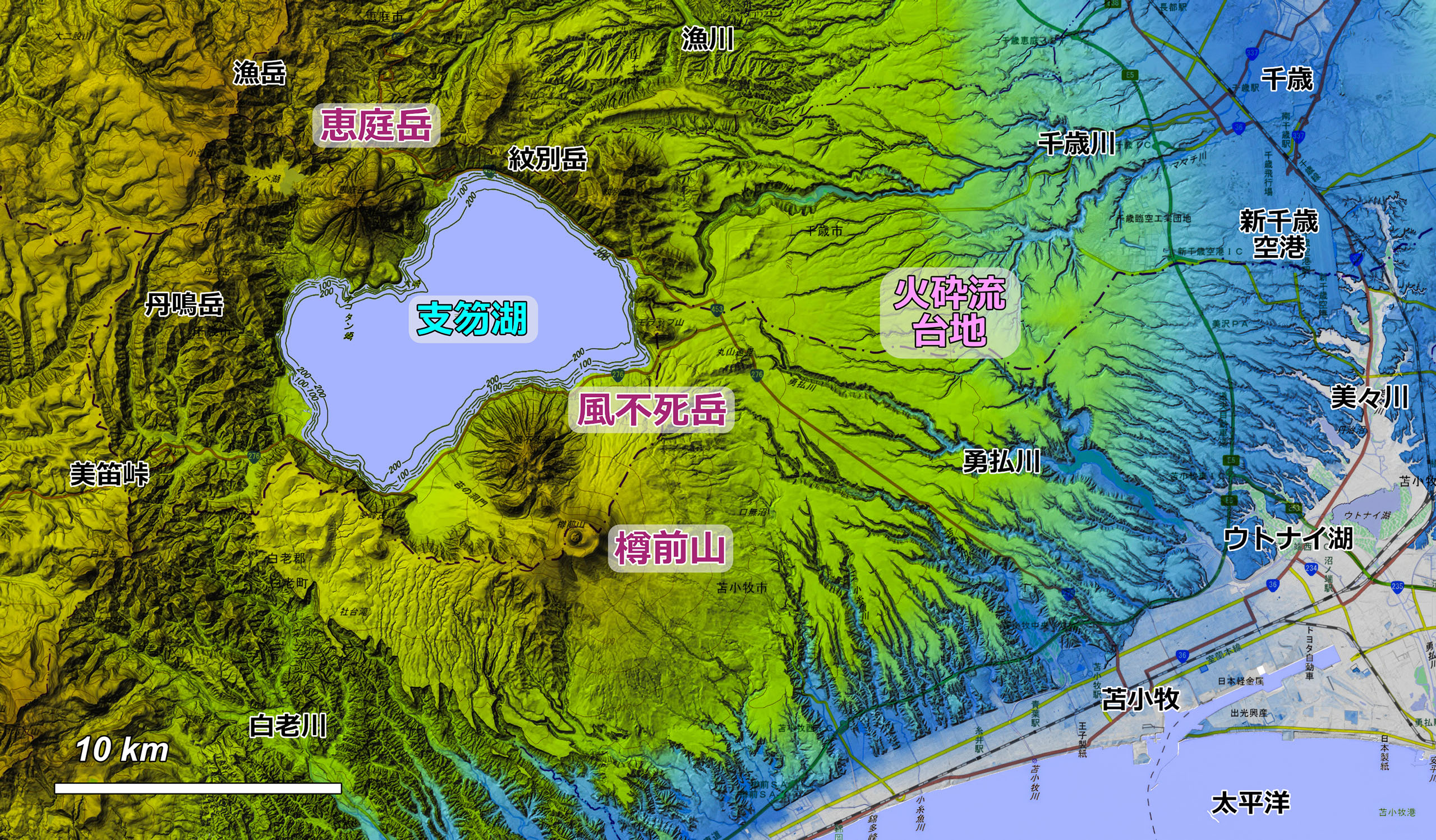 支笏湖周辺の陰影地形図(上図)は,支笏カルデラの作る大規模な火山地形を表現しています.もっとも印象的なのは,カルデラの東部に広がる広大な支笏火砕流台地でしょう.支笏火砕流は美笛峠以西にも広がっていますが,開析によるものかあまり目立ちません.