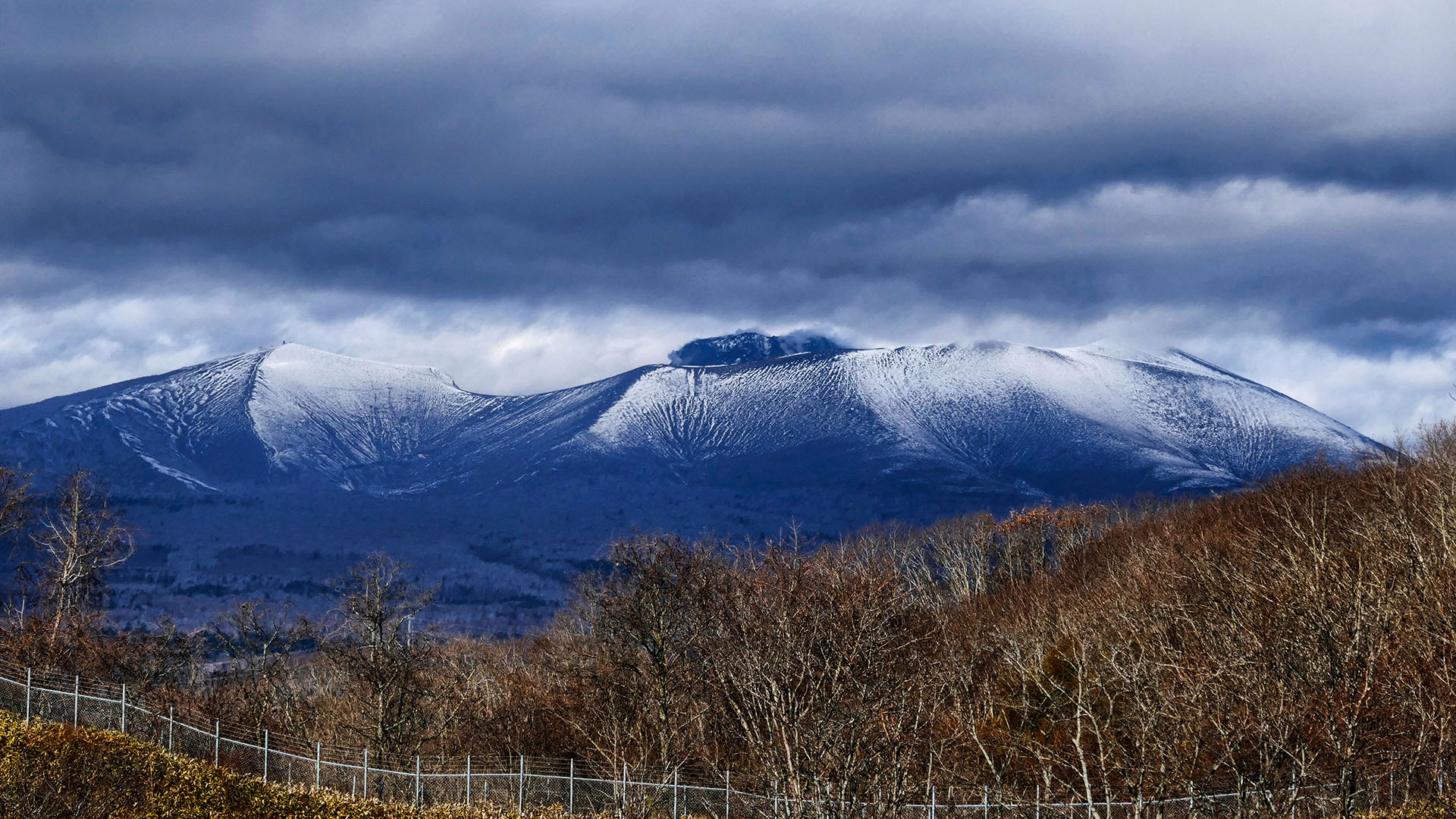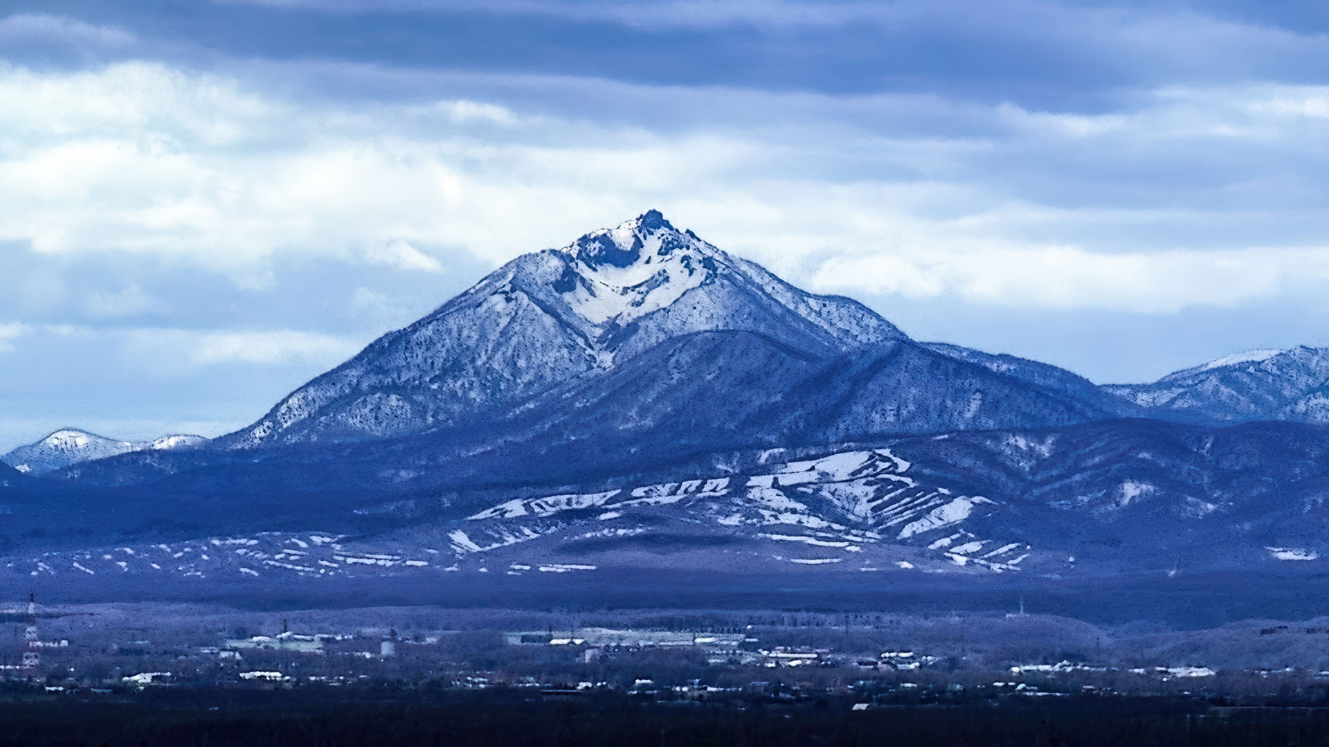 恵庭岳(1320 m)は,実は札幌市内の多くの場所からその特徴的な鋭い山容を望むことができます.個人的にはそのジャストなビューポイントは,おそらく南区滝野霊園です(右写真上).低い山の向こうに,ほぼ遮るもの無くその鋭い山容を捉えることができます.季節的には初雪の頃か雪の残る春,逆光になりやすいので曇りの日が狙い目です.