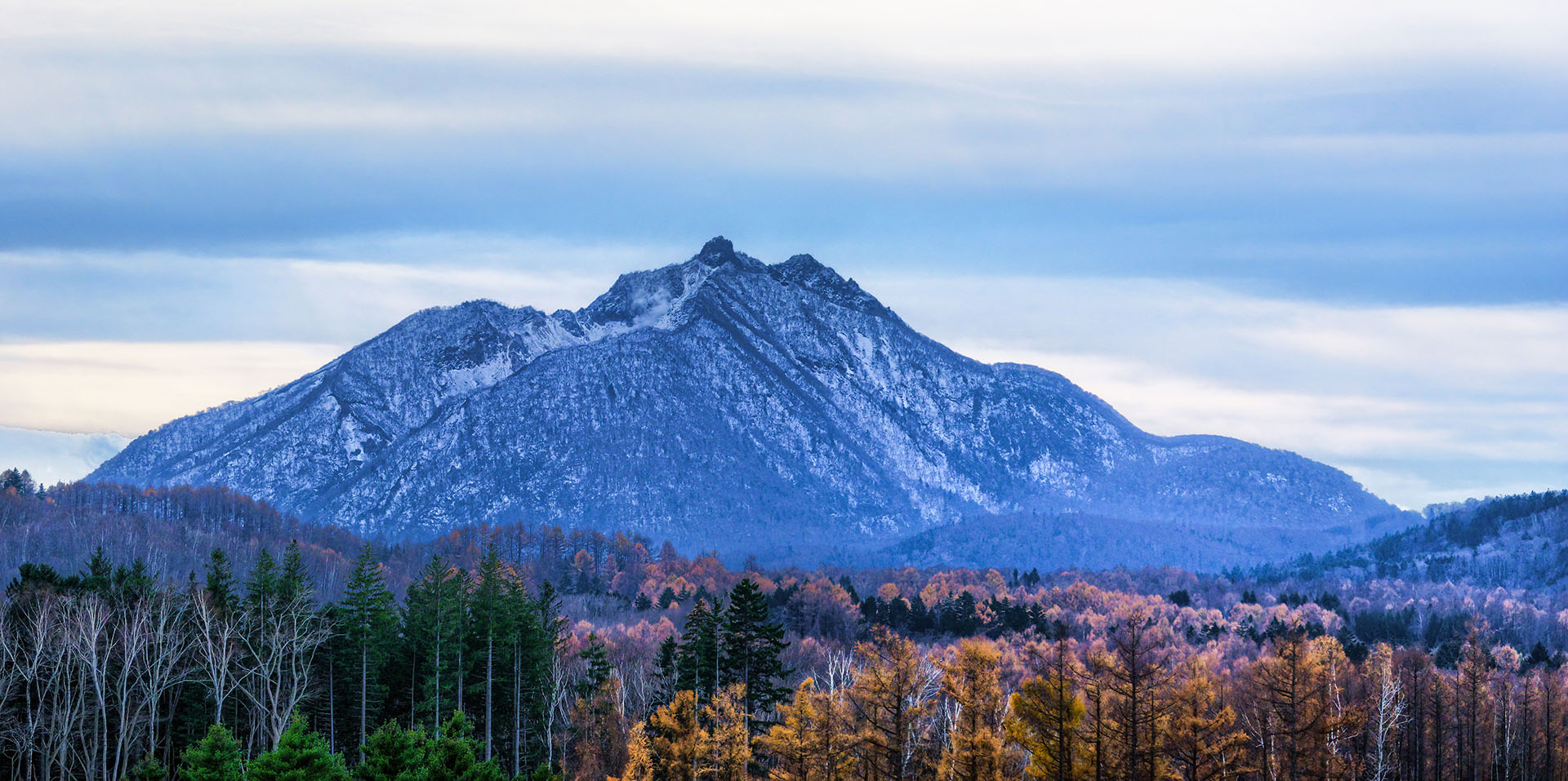 神威岳.左奥の平らな稜線は烏帽子岳.焦点距離 200 mm.小金湯さくらの森から 2024年11月撮影.