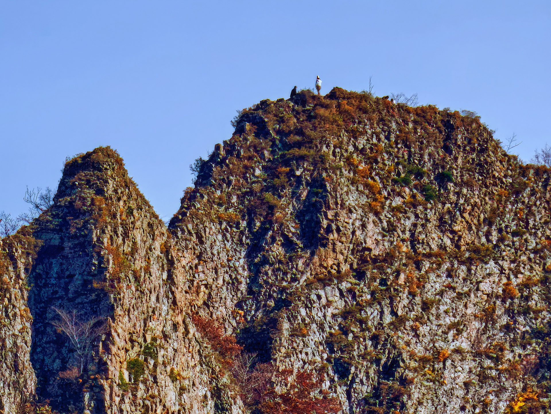 左の写真は,八剣山の山頂の望遠写真です.山頂には二人の登山者が立っていますが,見ていると恐ろしくなるような絶壁の傾斜と高さです.