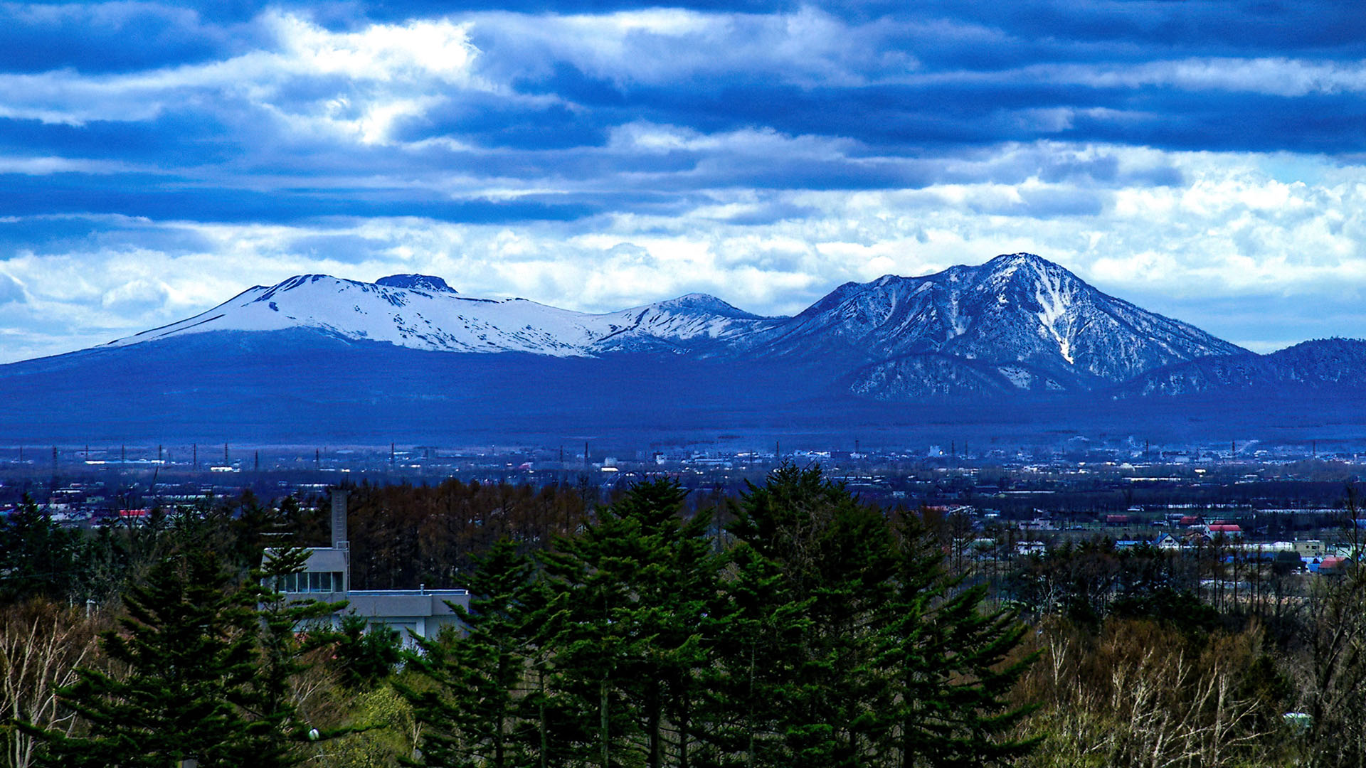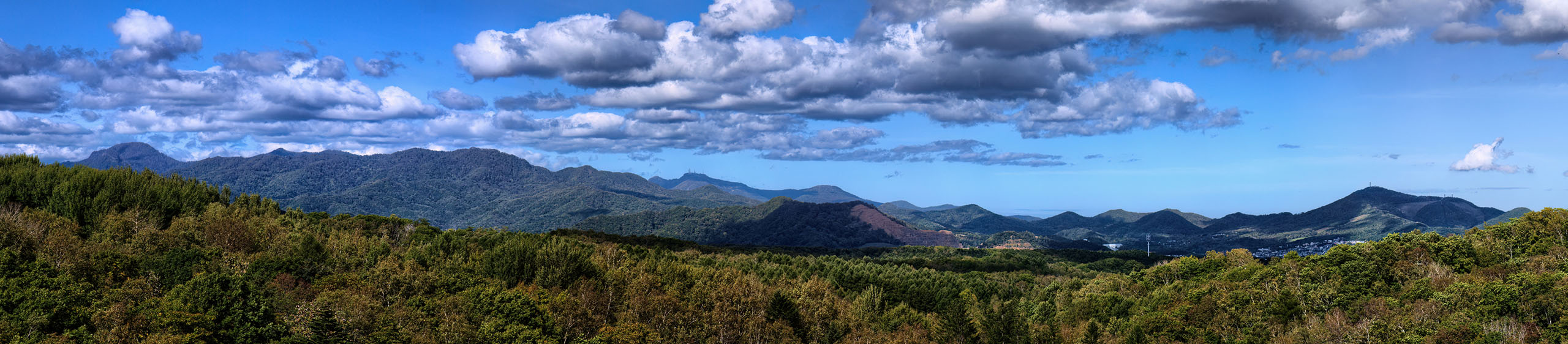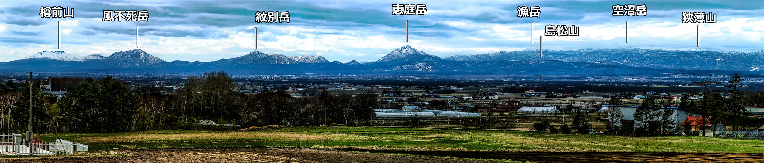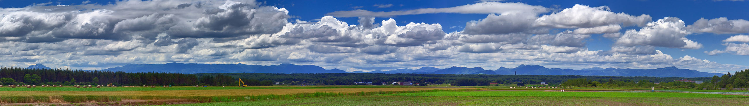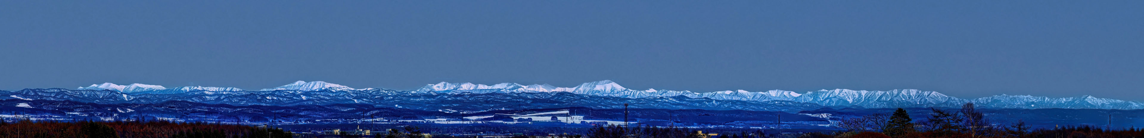 ただ,札幌から遠距離にある日高山脈はさすがに haze で霞んでおりコントラストがありません.そこで,階調の回復のため自分のスキルの限界までトーンマッピングなどのレタッチを行いました(下写真).その副作用で,パノラマ合成の際不均一になっていた空の階調が強調され,不細工なまだら模様になってしまいました.最後の手段として,Photoshop で sky-replacement を施しています.嘘くさいですが,少なくとも日高山脈の部分は嘘ではありません.