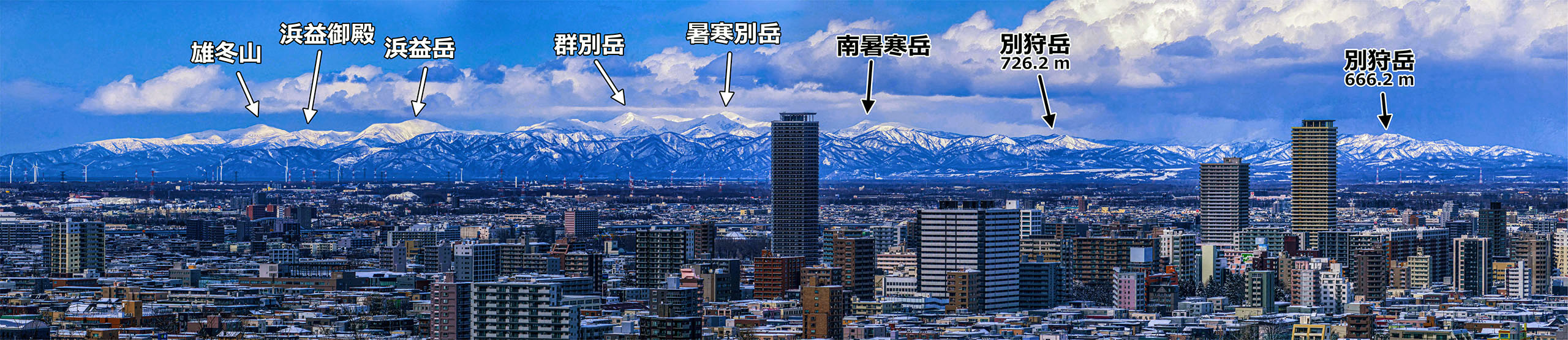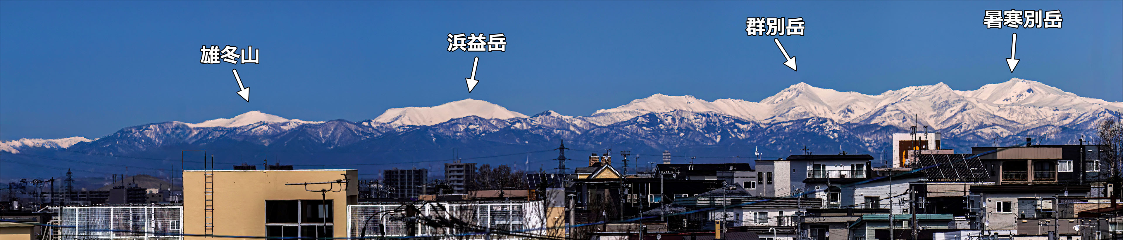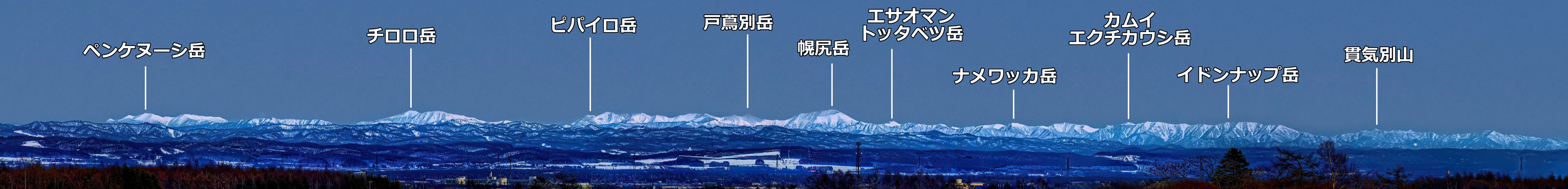 山名を見るとお分かりのように,日高山脈の北部から中央部にかけての部分が見えているようです.なにしろ日高山脈の最高峰・幌尻(ぽろしり)岳(2052.4 m)が見えているのですから感動します.直線距離は 92 km(!)です.