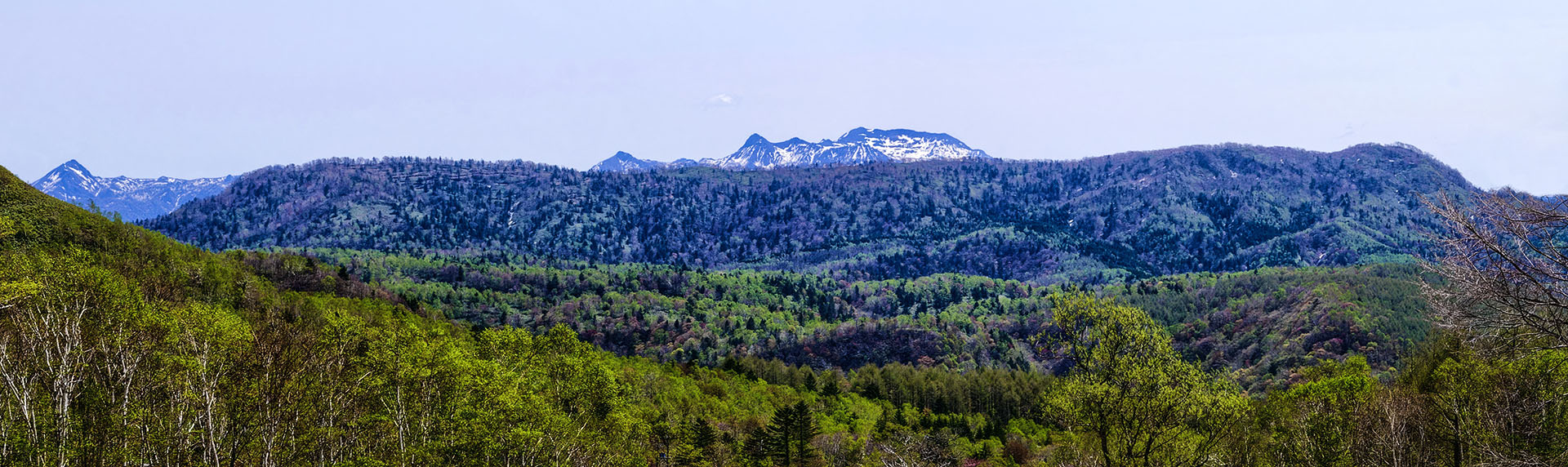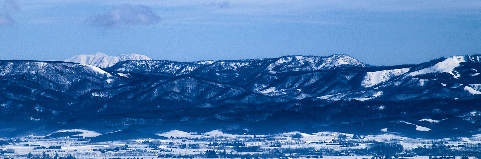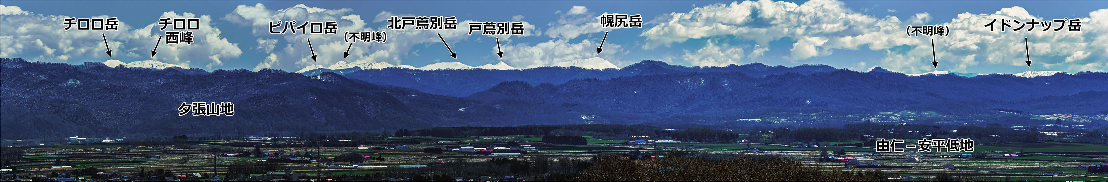 下の写真は,芦別岳~夕張岳,そしてその前面の夕張山地を撮ったパノラマの一部ですが,たまたまというのか,なんと日高山脈がちゃんと写っていました.撮影場所が夕張山地に近いので,日高山脈はその影にほとんど隠れていてほとんど雲と区別が出きないのですが,撮った写真をよくよく見ると冠雪の日高山脈のピークが.