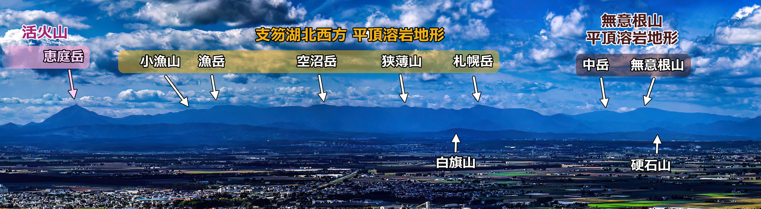 恵庭岳から右側の札幌西方山地前面には緩く傾斜する平坦面が見えています.写真の右端が北広島市街で,そのすぐ右には札幌市街がありますが,写真には入っていません.この緩傾斜平坦面は,支笏火砕流の作る台地です.恵庭岳から北広島市街までの距離は約 30 km です.