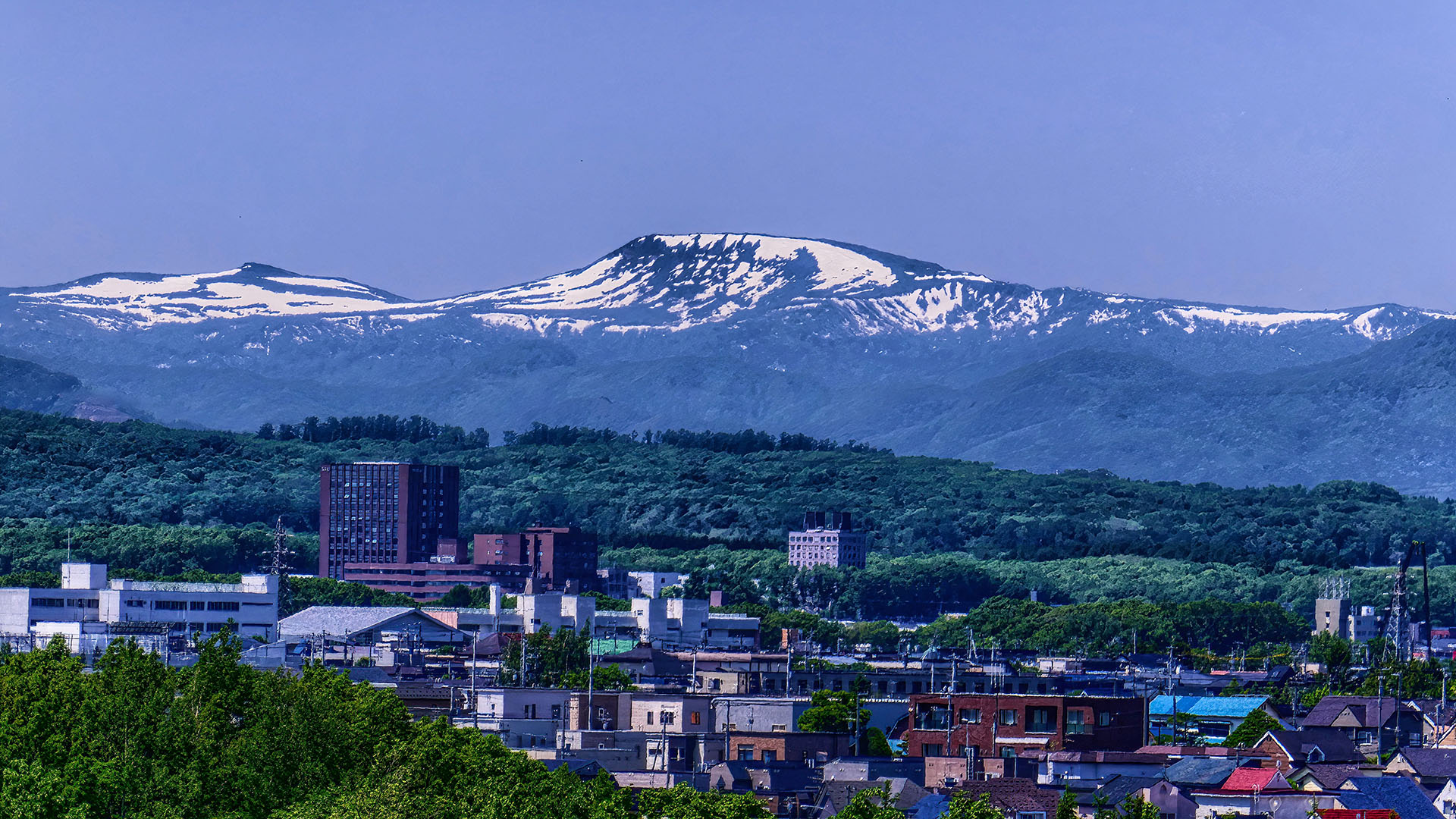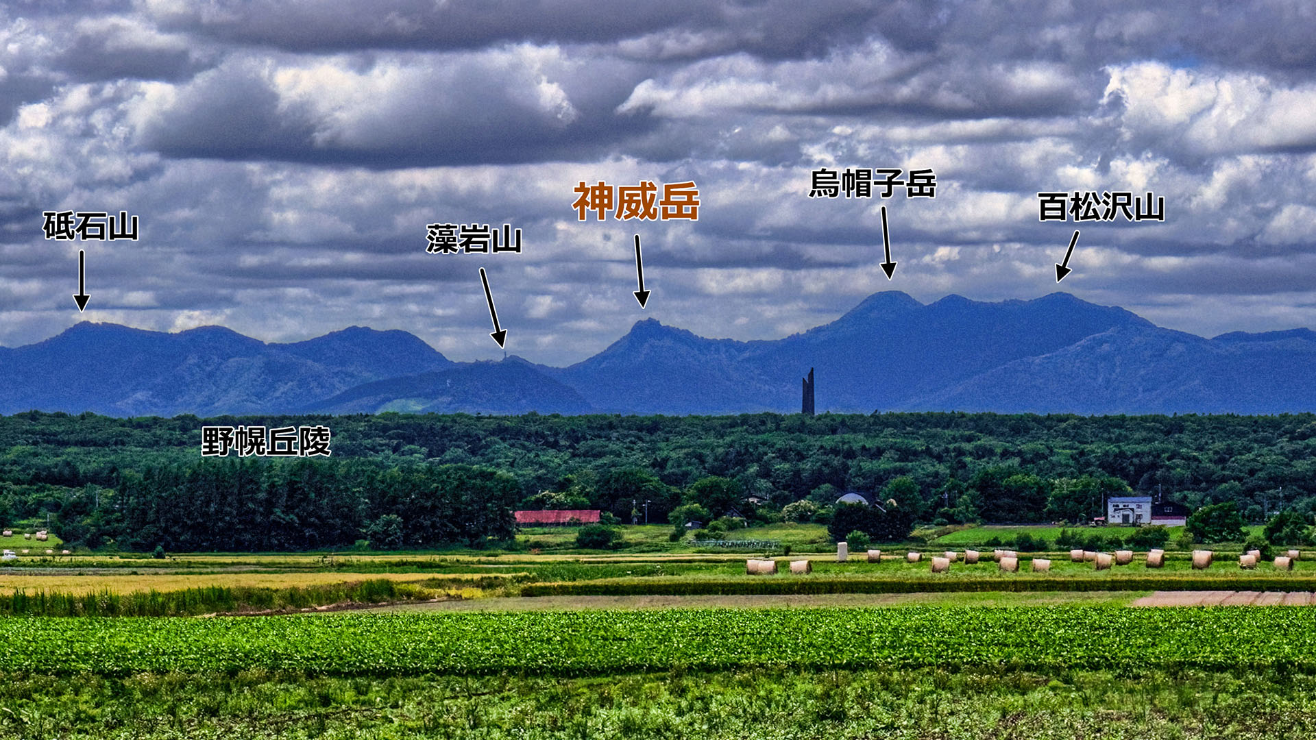 一番右の最高ピークが暑寒別岳で,撮影地点からの直線距離は約 82 km(!)です.その右の南暑寒別岳は残念ながら丘に隠れて見えませんでした.