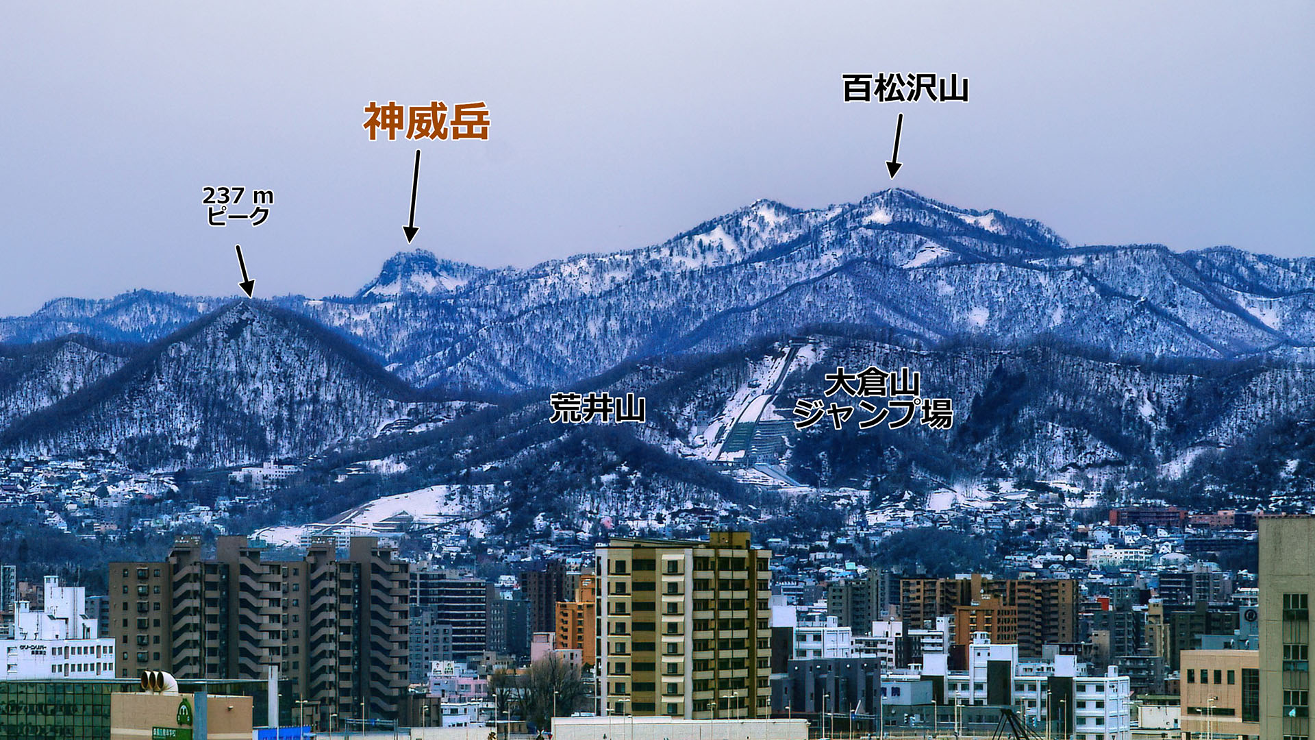 次が,札幌市街からということで,北海道大学理学部6号館10階(私の昔の勤務先)から百松沢山の左に見える神威岳.札幌のビル街・大倉山ジャンプ場の向こうというビューが印象的です.この角度では烏帽子岳は稜線に隠れているようです.札幌市街の西方が基本的には旧火山地帯であるということが実感できる風景です.左に見える 237 m ピークのようなドーム状の火山地形は,札幌市民におなじみの三角山や円山と同じ性格のものでしょう.