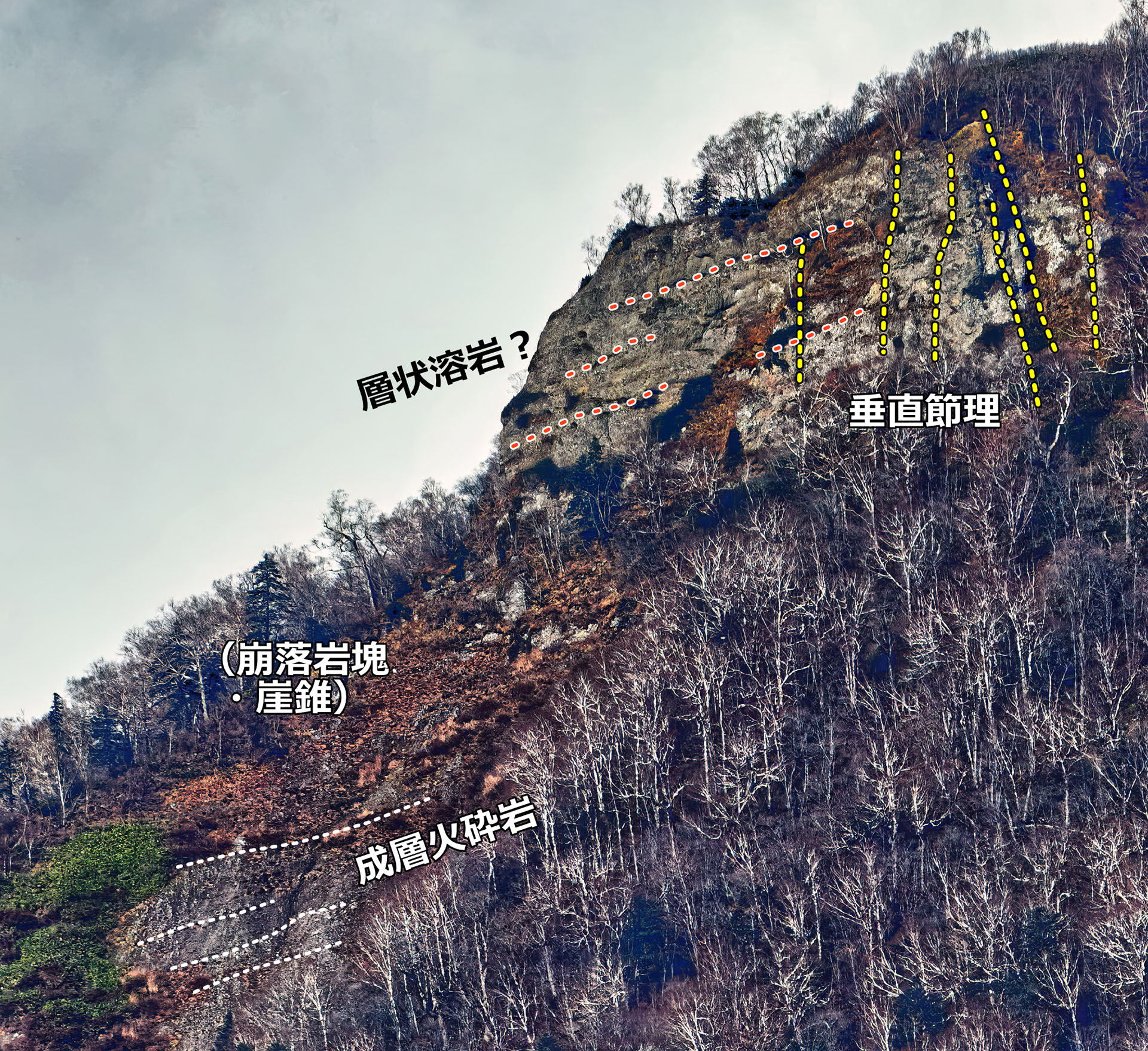 頂上下部は “ハカマ状” になっていて,岩体の崩落物が崩積・崖錐状になっています.その下位にはちょっと見た目には露岩がなく,どのような岩体からなるものかは不明です.これについては後述します.