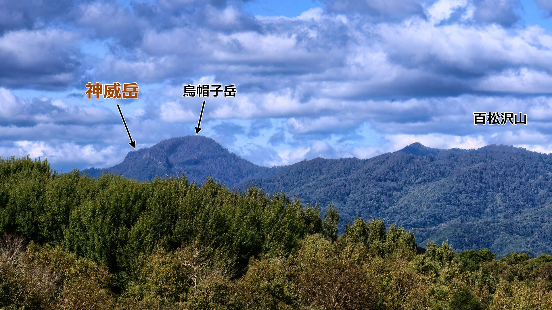 最後が,南東側からのビューです.この角度では,神威岳は烏帽子岳のピークの左手前に重なっていて,特に積雪期でないとちょっと見には気づきません.写真右側の雲の下に百松沢山が見えています.
