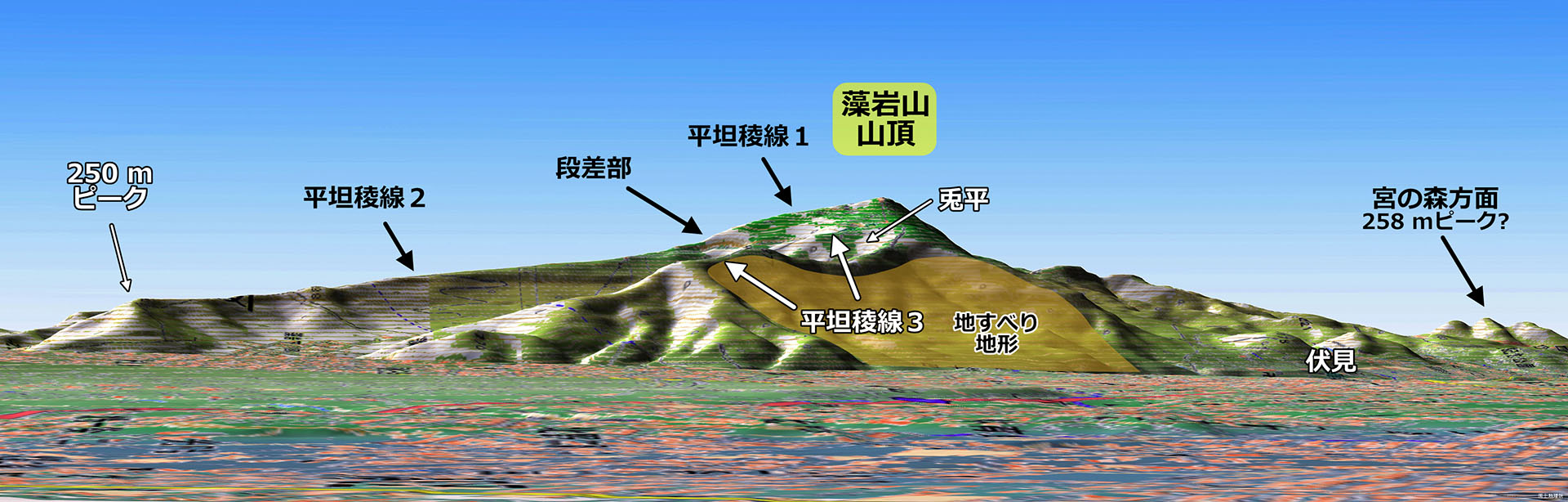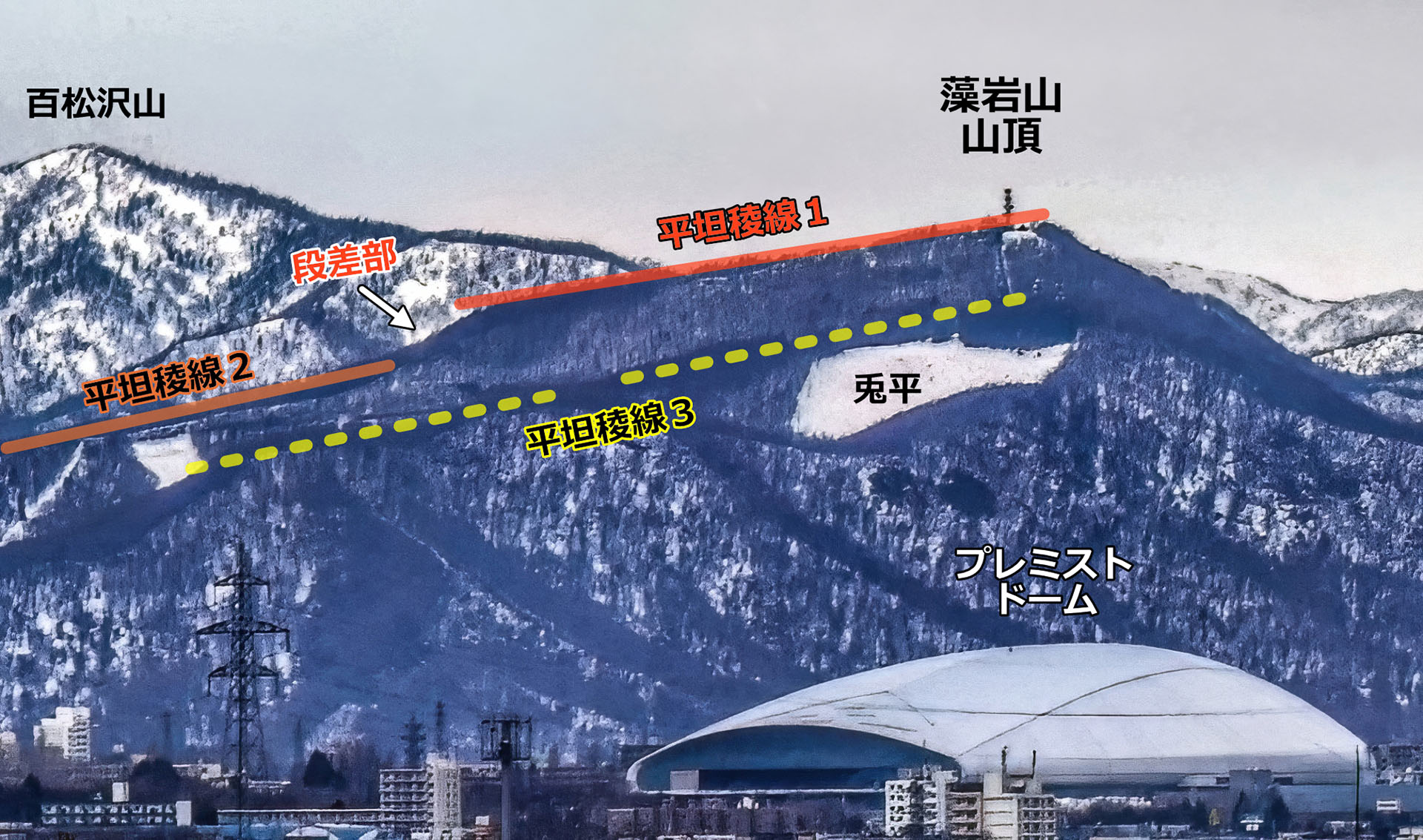 藻岩山山頂から向かって左に傾斜する平坦な稜線は非常に顕著で,ここではこれを “平坦稜線1” と呼びます.この左端はやや傾斜の急な段差状になっていて,その先に非常に長い “平坦稜線2” が続いています.段差の高低差は 30 - 40 m 程度と思われます.