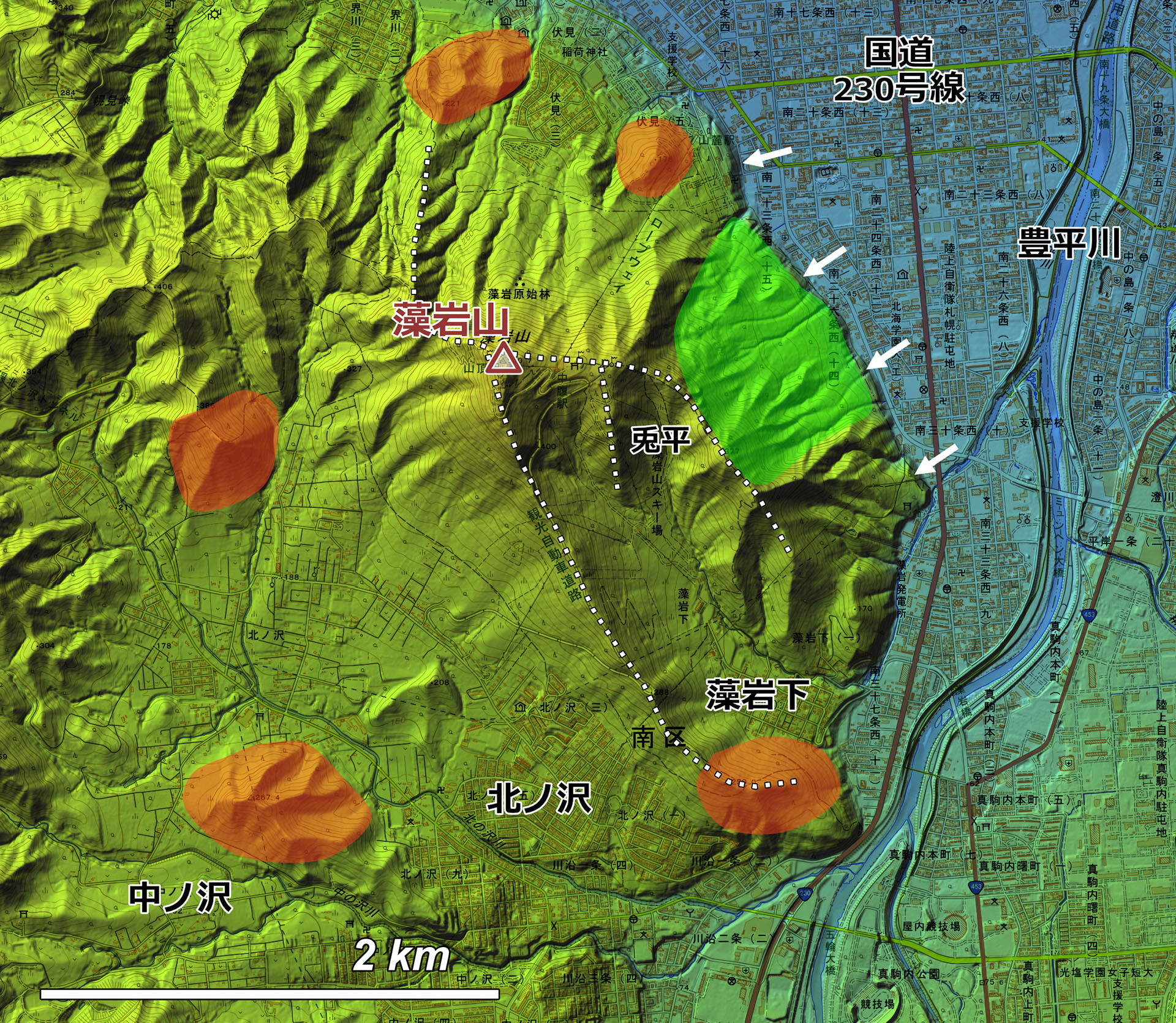 最初に述べたように,この地すべりは5万年以上前に発生したもので,その後活動した形跡はありません.しかし宮坂ほか(2007)によると,その崩積土塊の厚さは約 30 m あり,その末端は現在の住宅地まで達しています.現在は安定していても地震や降雨などにより再活動しないという保証は必ずしもありません.