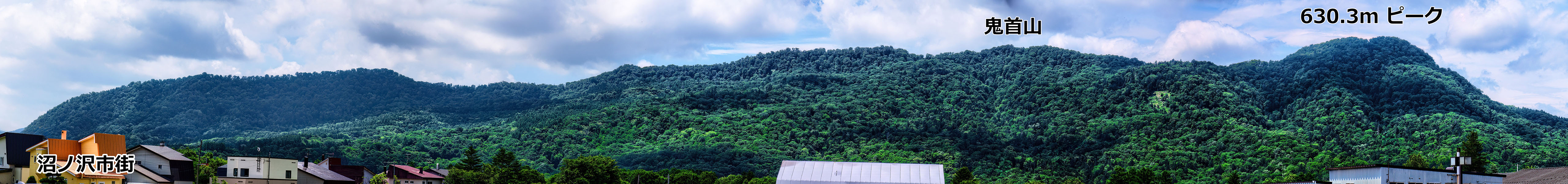 下に,この鬼首山地すべりを札幌とは反対側-夕張側から見たものを示します.撮影地点は上の陰影図をご覧ください.一番右に見えるのが 630.3 m ピークで,その直下の地すべりは陰になって見えていません.この斜面のほぼ全体が鬼首山地すべりです.下から見上げた広角ビューを地形図と照合するのは至難の業で,地すべり地形を示したシェード範囲はかなりいい加減なものです.いずれせよ,かなり大規模な地すべり地形であることが実感できると思います.