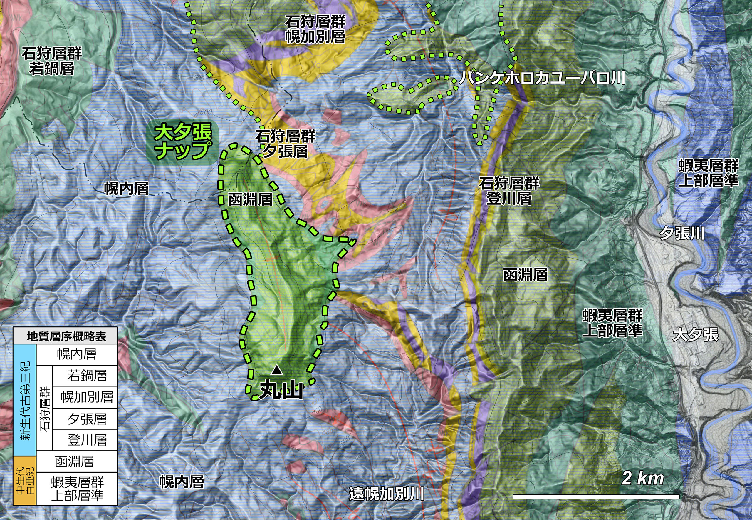 この明瞭なテーブル状地形は,標高 870.6 m のピークを南端部とする南北長さ約 2.2 km の平坦な尾根です.この尾根を形成しているのは,中生代白亜紀後期の地層である函淵層の砂岩層です.その周囲(下位)には,新生代古第三紀始新世の幌内層と石狩層群が分布しています.幌内層は主に軟質の海成泥岩から構成されており,その分布地域には函淵層砂岩をキャップ・ロックとする大規模な地すべりが多数存在しています.石狩層群は陸成~浅海成の砂岩・泥岩を主体とします.石狩層群は石炭層を含む挟炭層として有名です.これらの地層の上下関係については下図左下に簡単な層序表を入れましたので参照してください.