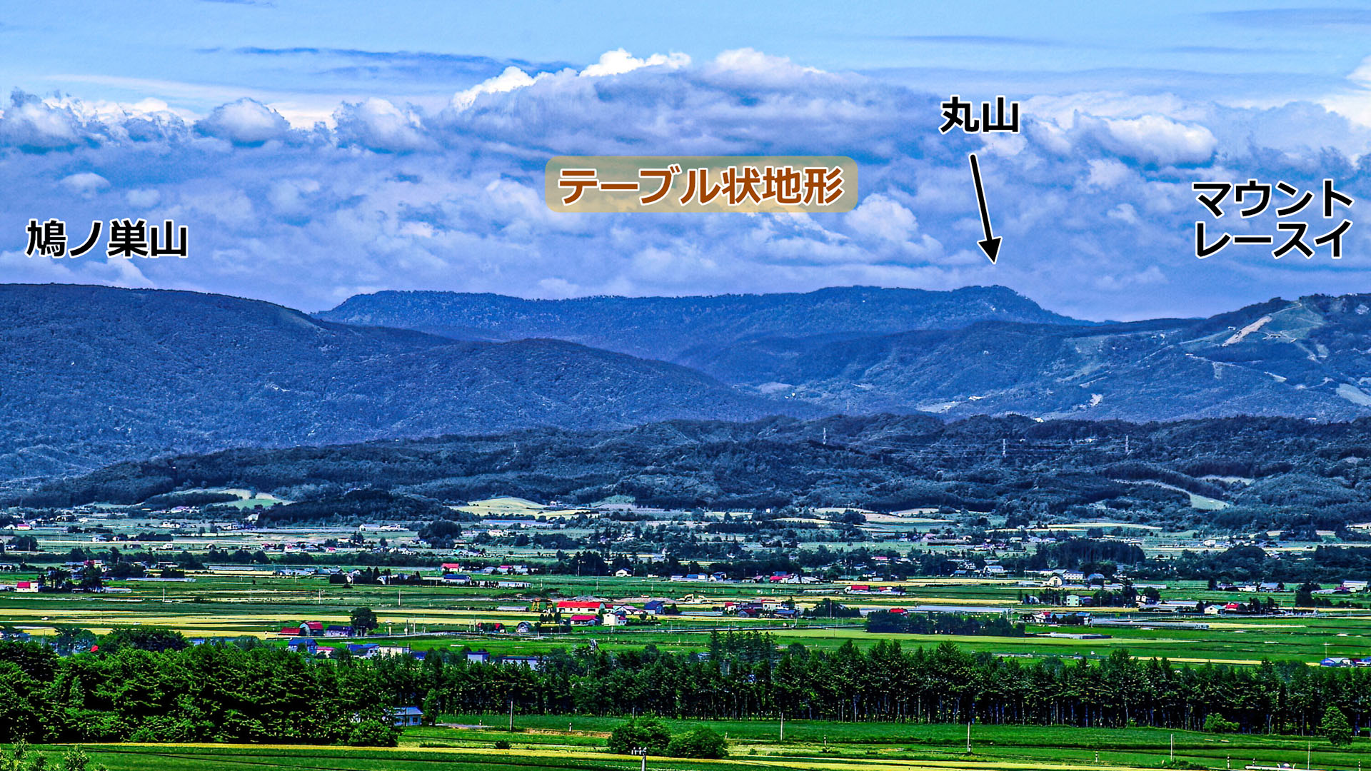 夕張山地の地形を遠望して気が付くのは,パノラマ写真左側の丸山から左に見える “テーブル状地形” です(右写真).