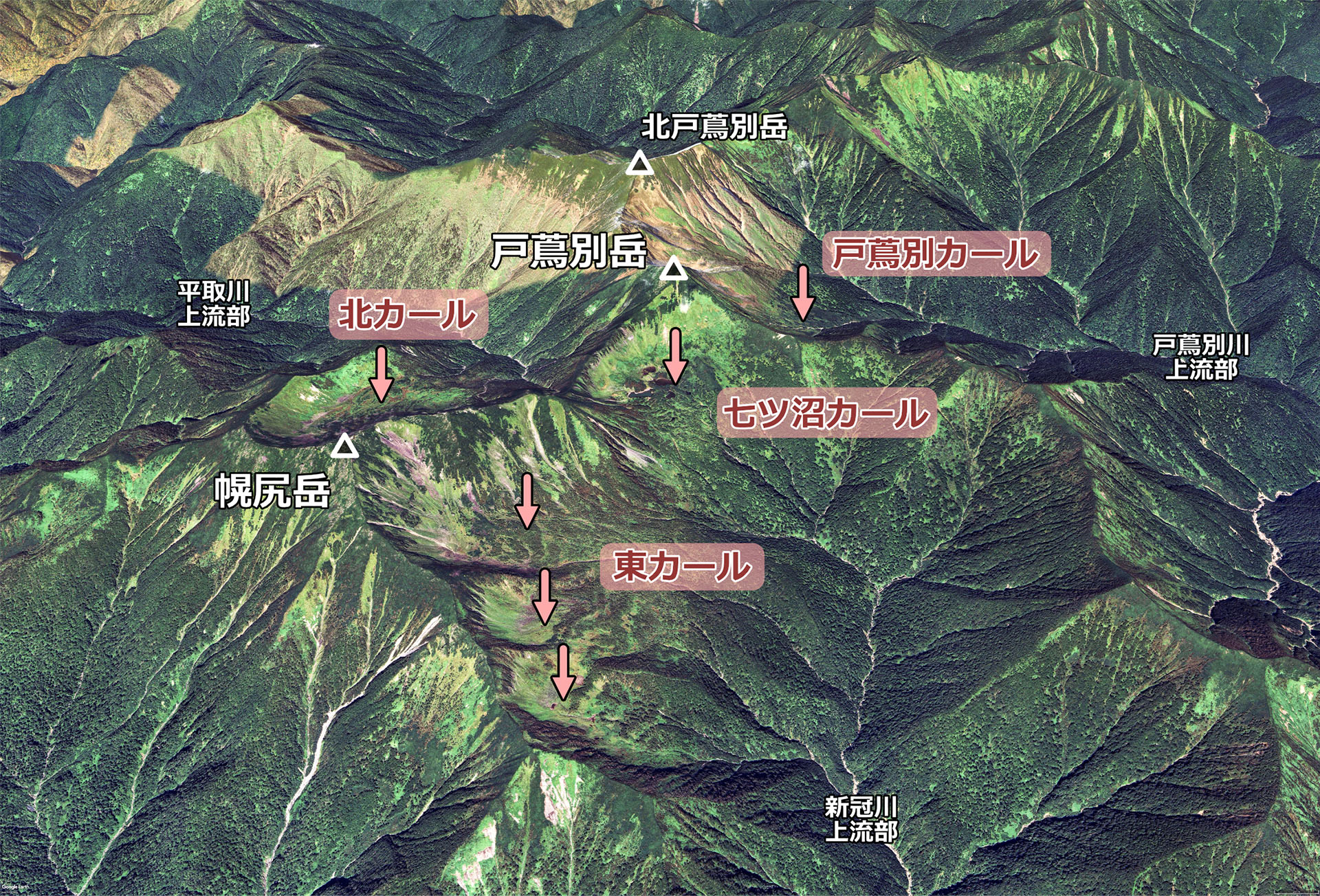 幌尻岳周辺のカール群(オレンジ色矢印).俯瞰図は Google Earth による.マウスオーバーでカール群説明を消去したものを表示する.