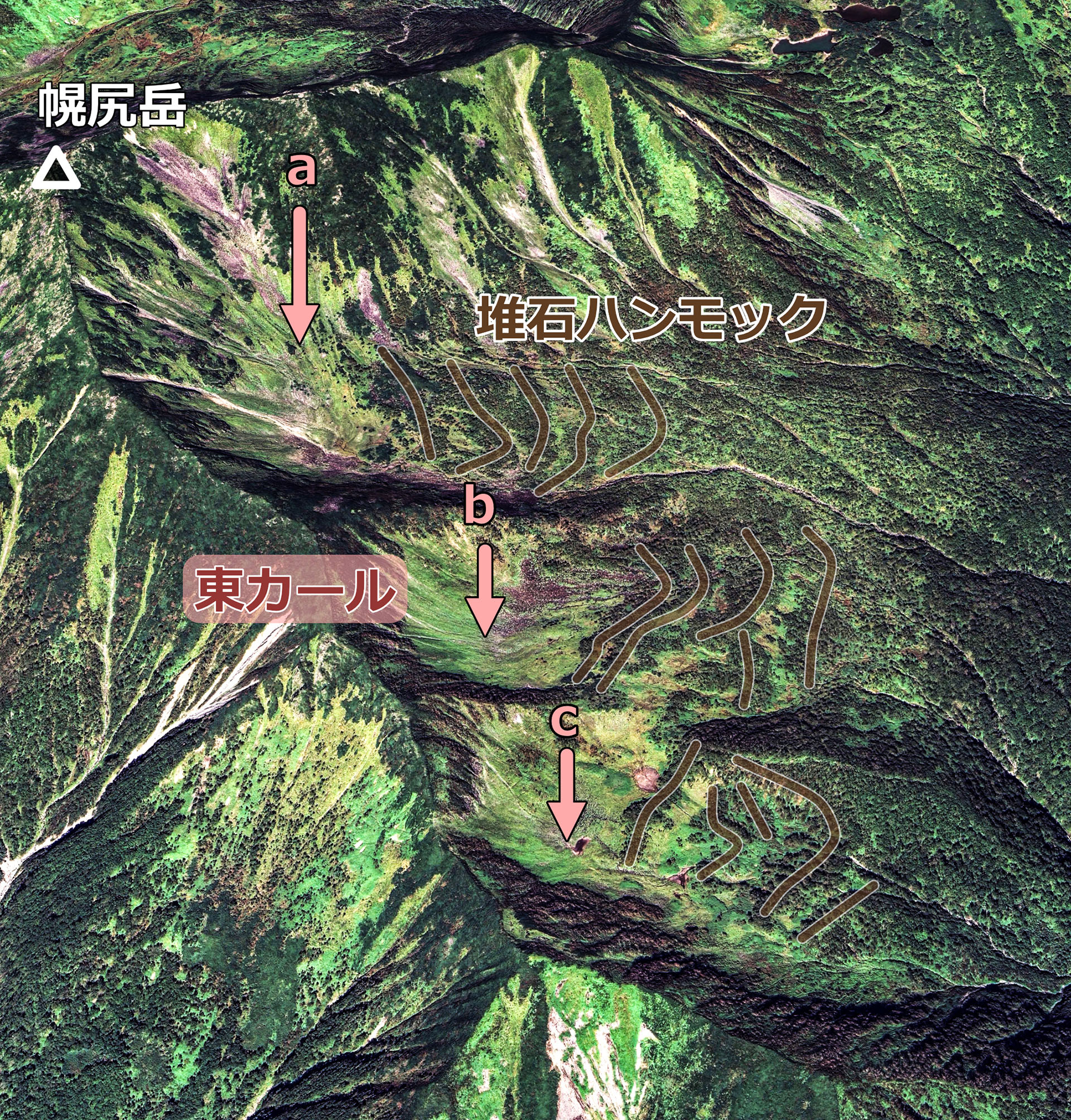幌尻岳東カール(茶色矢印).俯瞰図は Google Earth による.マウスオーバーでハンモック説明線を消去したものを表示する.