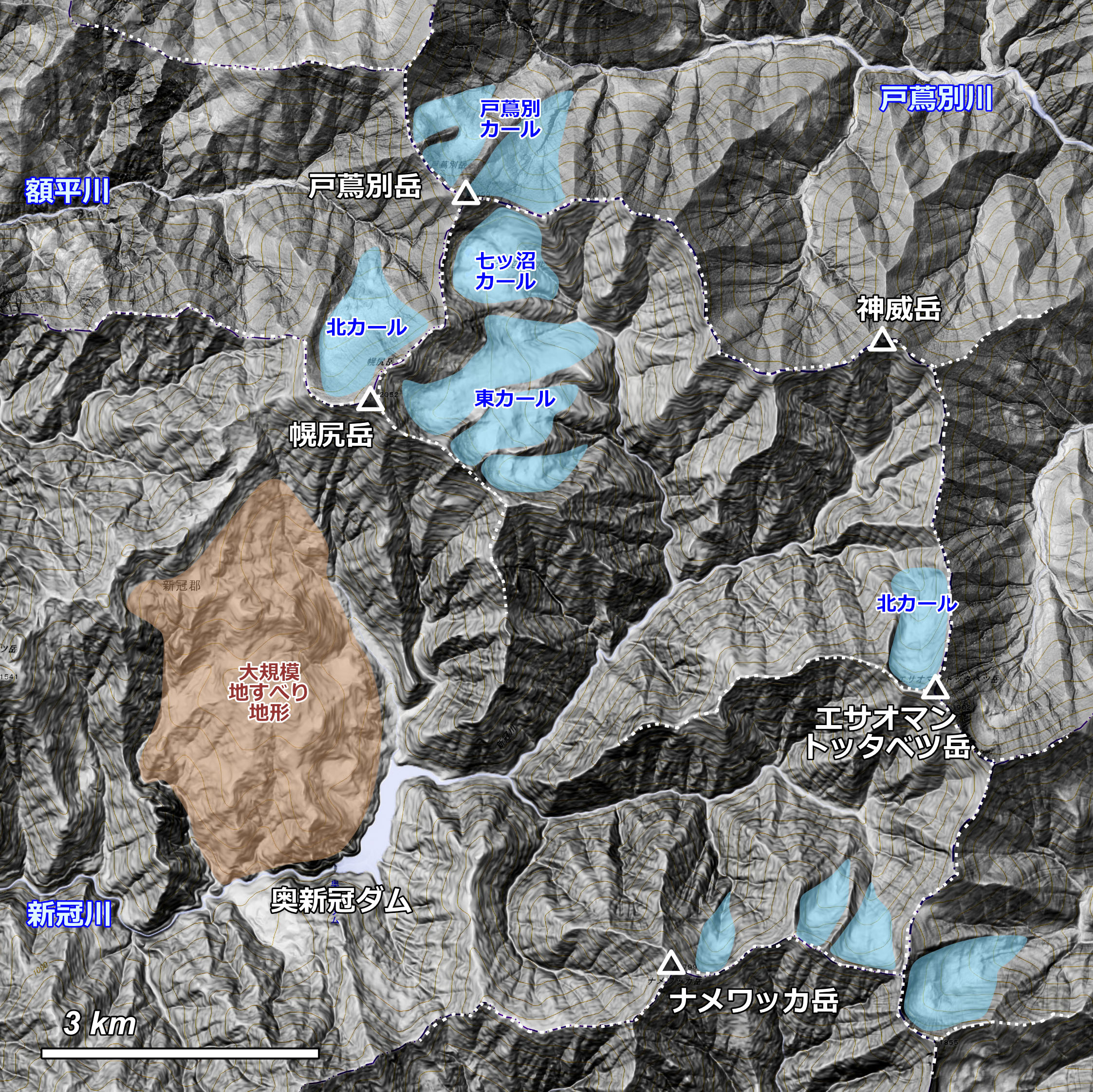 Wikipedia の 圏谷 のページには,この図に示しているナメワッカ岳周辺のカール地形はリストアップされていませんので,単なる気のせいかもしれません.