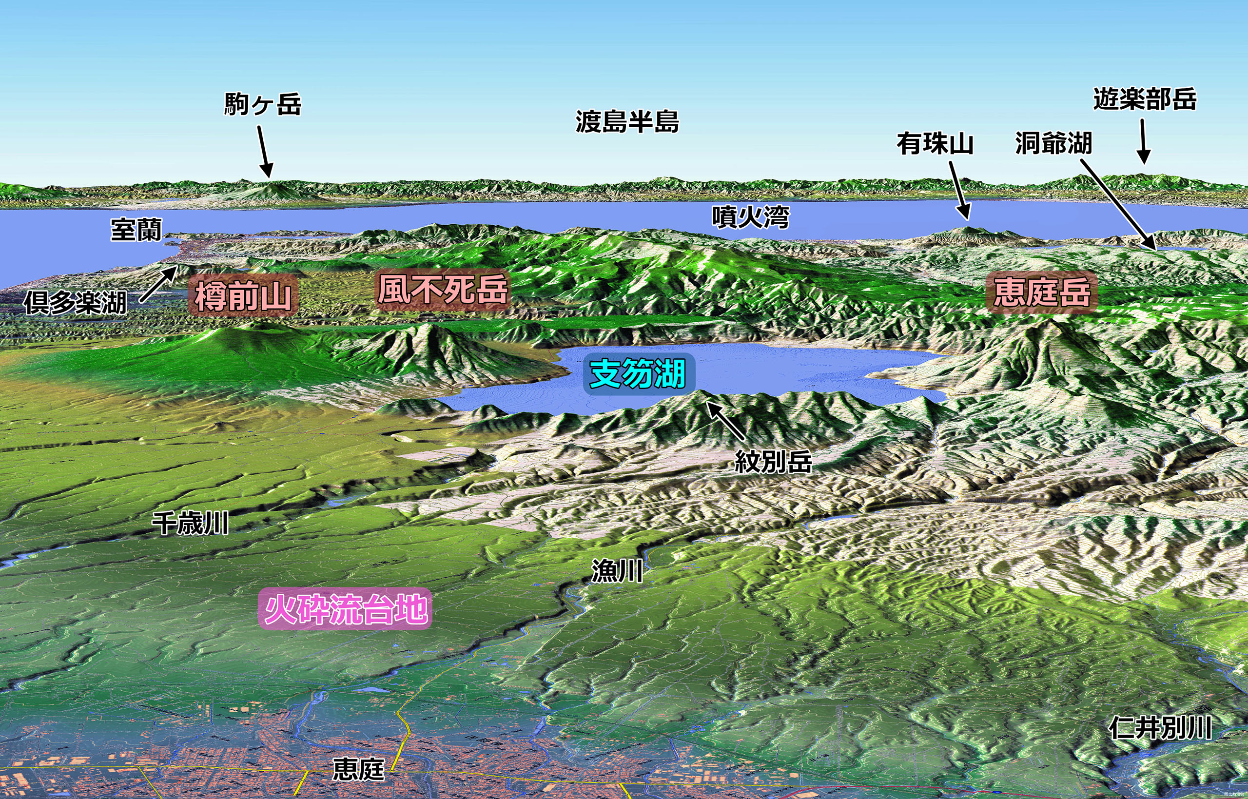まず,支笏湖とその周辺の樽前山~恵庭岳からなる支笏カルデラの形状がはっきりと見えます.その前面には火砕流台地が広がっています.それらの向こうには,火山活動とは実は関係ない噴火湾とそれを囲む渡島半島が望めます.駒ヶ岳は活火山です.噴火湾の手前には,第四紀活火山地帯を構成する,いずれもカルデラ湖の倶多楽湖・洞爺湖があります.雄大な風景です.この景観を実際に見ることができないのが返す返すも残念です.