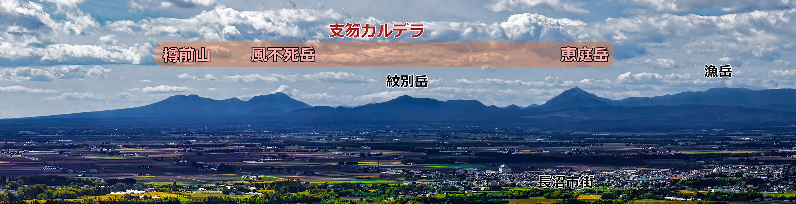 恵庭岳から右側の札幌西方山地前面には緩く傾斜する平坦面が見えています.写真の右端が北広島市街で,そのすぐ右には札幌市街がありますが,写真には入っていません.恵庭岳から北広島市街までの距離は約 30 km です.