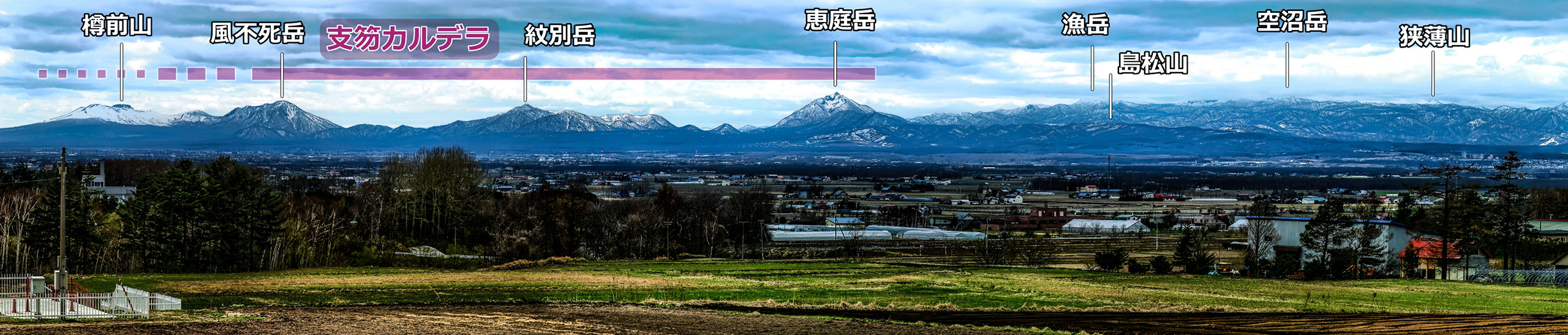 下のパノラマは,長沼町から見た樽前山~恵庭岳です.左端の冠雪した特徴的なドーム状のピークが樽前山.その右が風不死(ふっぷし)岳です.中央部のピラミッド状のピークが恵庭岳です.