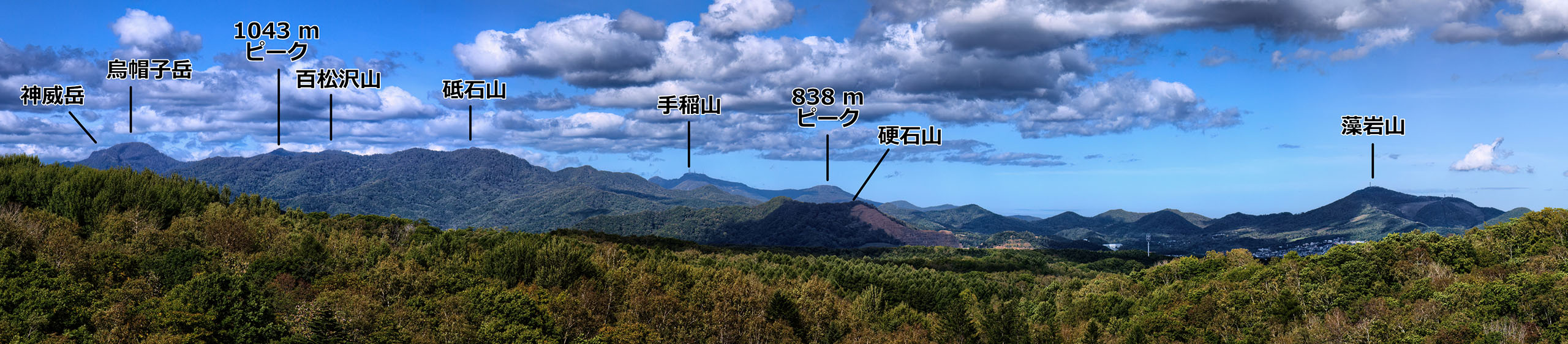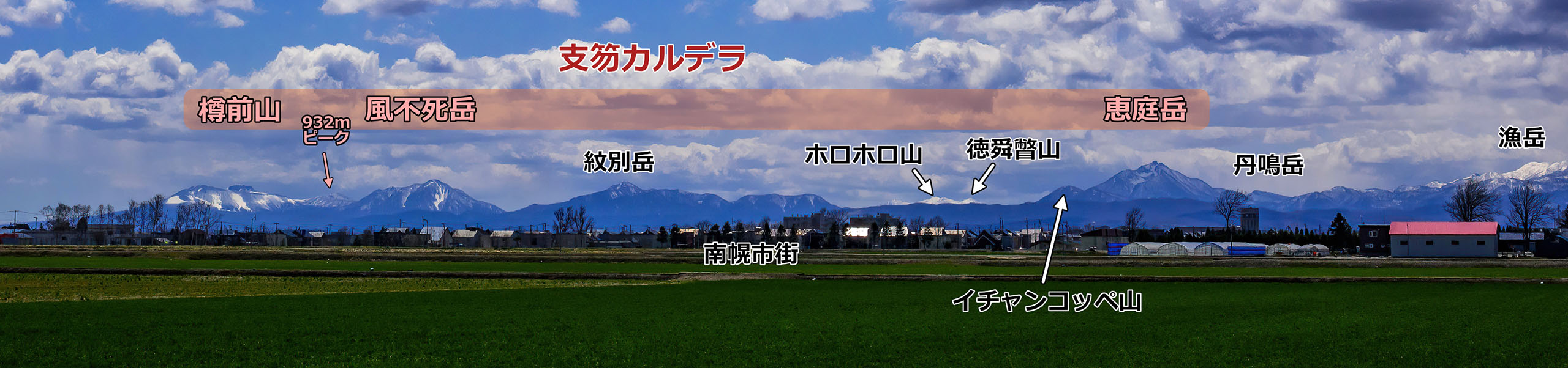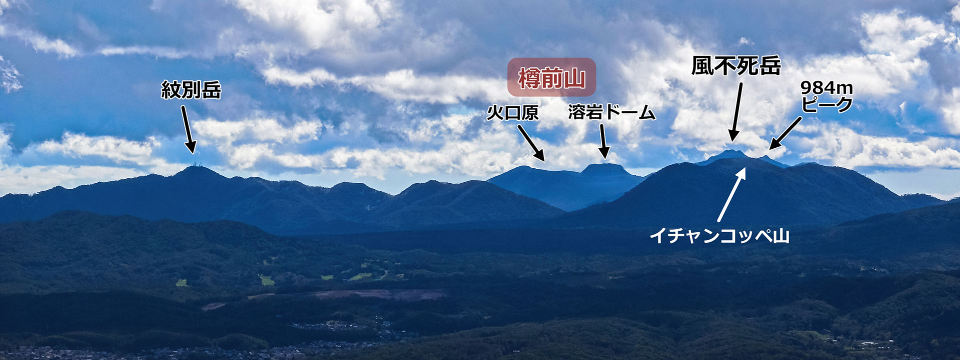 札幌の東側郊外に出れば,上のパノラマ写真にあるように恵庭岳はモロ見えとなります(右写真中).山頂部の形状を見ると視線の違いがこんなにも山の見え方を変えるのかと驚きます.恵庭岳の右手前に重なっているのはイチャンコッペ山(828.8 m)です.