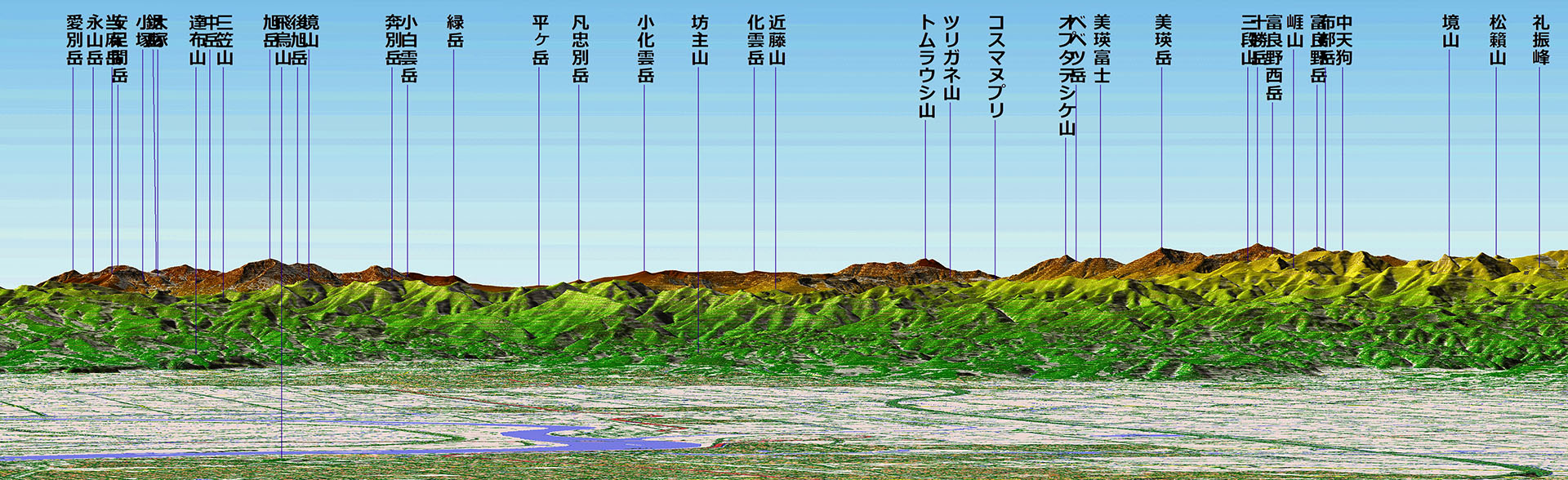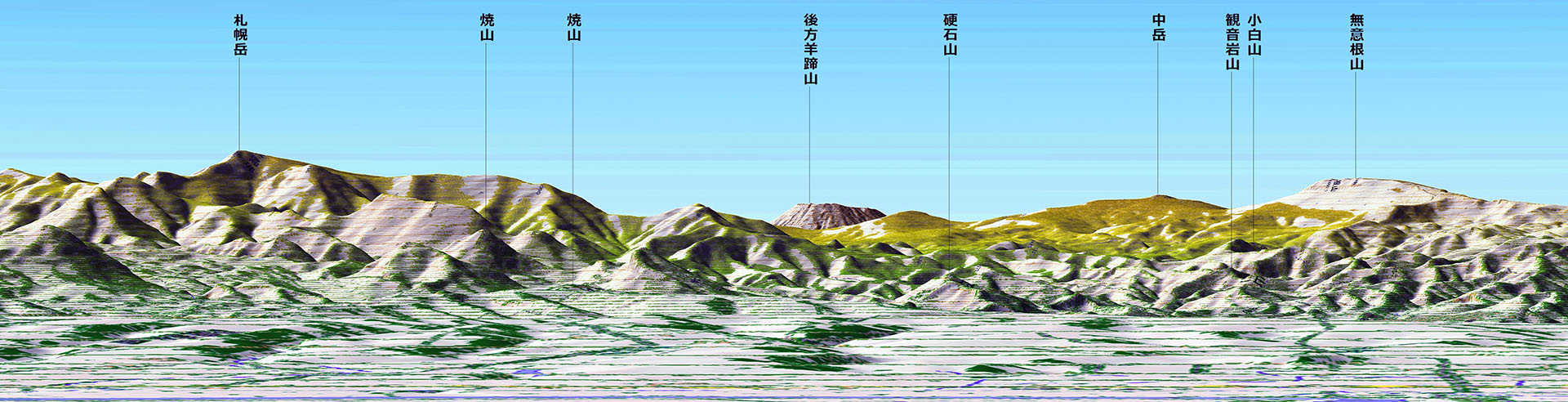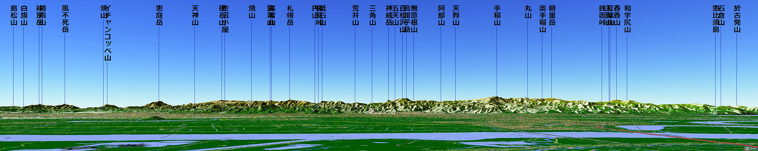 このテーマの発端は,つい最近のことです.私の属する某地質関係法人の会員の方から『藻岩山山頂から見える大雪山系のピークの名前が分からないか?』というリクエストを受け,カシミール3D(+カシバード)でシミュレートして景観図を作成しました.それを契機として,大雪だけではなく他のいろいろな山々についてもシミュレートしてみると,それまで自分でもちゃんと意識していなかったことが明瞭になりました.私が昔から “あ~札幌(周辺)からも見えるんだ?!” と漠然と思っていた山々が,はっきりと名前付きでその姿を現わしたわけです(下図).