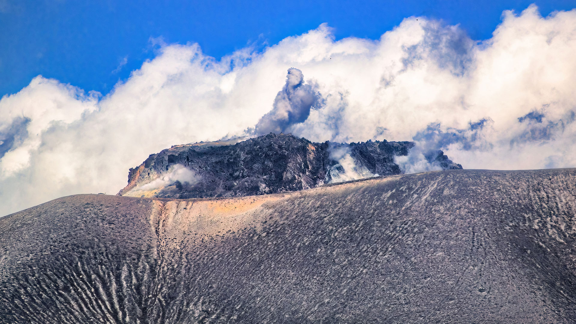 この地域のランドマークともなっている山頂の溶岩ドームは 1909 年の噴火に伴って出現したもので現在でも活発な噴気活動を示し,直径は約 470 m,火口原からの比高は約 140 m で頂部は平坦になっています.これが火口原の形状を保った隆起によるものかは分かりません.