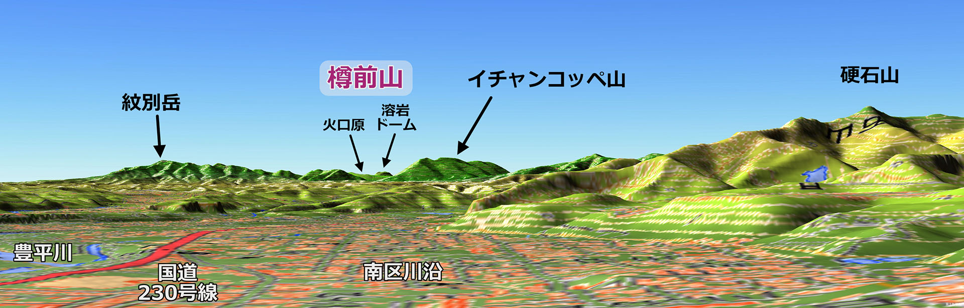 ところが...私も最近ある方からの問い合わせで初めて知ったのですが,札幌市南区北ノ沢周辺の住宅地からは,その山頂だけが奇跡のようにかろうじて見えています(左図).溶岩ドームだけではなく,火口原の一部もなんとか見えます.その右にあるはずの風不死岳はイチャンコッペ山の影になっていて,恵庭岳は硬石山で完全に隠されています.