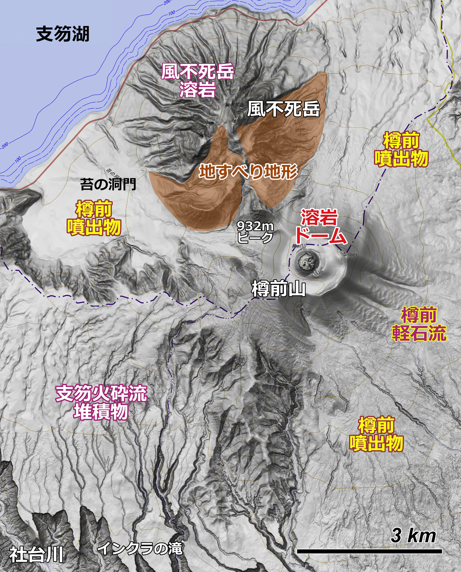 樽前山-風不死岳-恵庭岳は,数万年前に起きた大規模な火山噴火に関連して形成されたものです.その結果,支笏カルデラが形成されました.